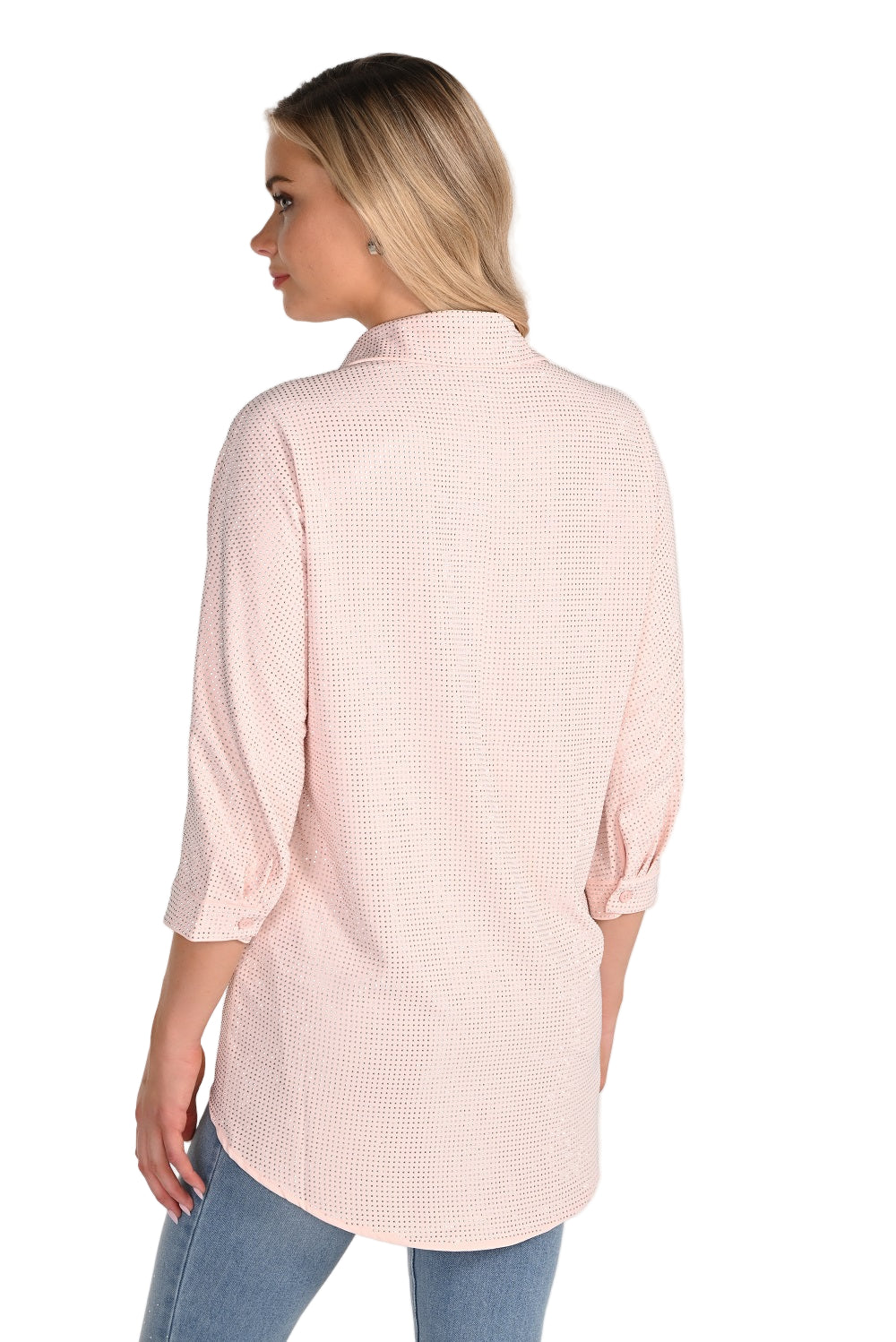 Elevate your wardrobe with this Frank Lyman Button Front Blouse, a refined piece that seamlessly transitions from office to evening. The sophisticated silhouette features a classic collared neckline with discreetly hidden buttons for a polished look, while three-quarter sleeves offer the perfect balance of coverage and elegance. The high-low hemline creates flattering movement and dimension, and an all-over rhinestone embellishment adds luxe sparkle and visual interest. Versatile enough for layering or wearing solo, this blouse is a timeless investment for the modern woman seeking understated glamour.