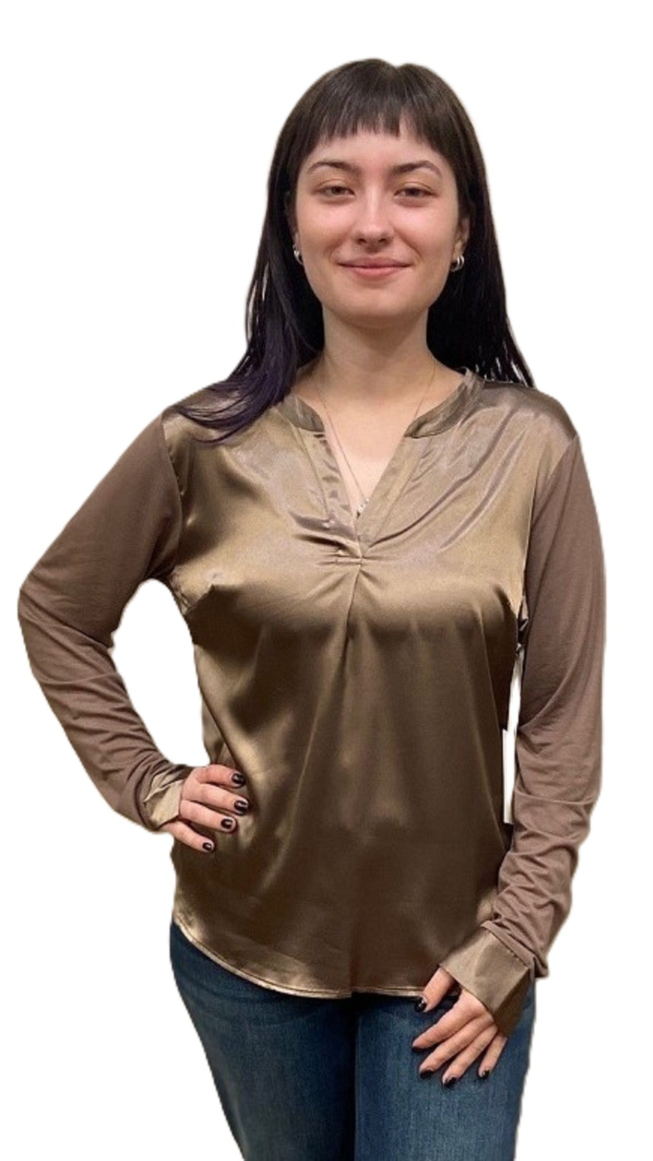 The Point Zero Satin Blouse combines elegance and comfort with a sleek mandarin collar and button cuff sleeves. Its satin front adds a luxurious shine, while the knit sleeves and back ensure breathable comfort and flexibility. The long sleeves and notched V-front neckline create a flattering, versatile look perfect for both work and casual occasions. This blouse effortlessly blends style and ease, making it a must-have addition to your wardrobe.