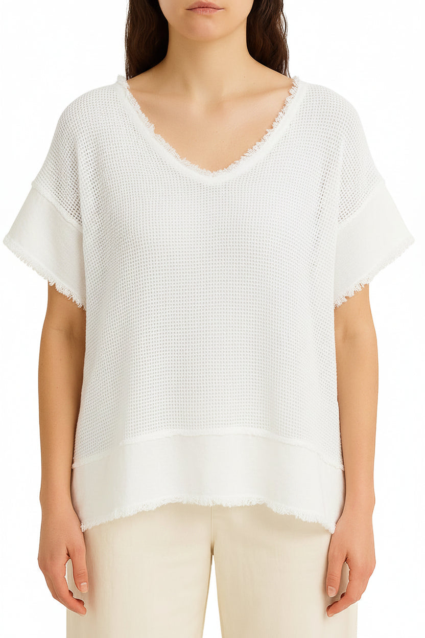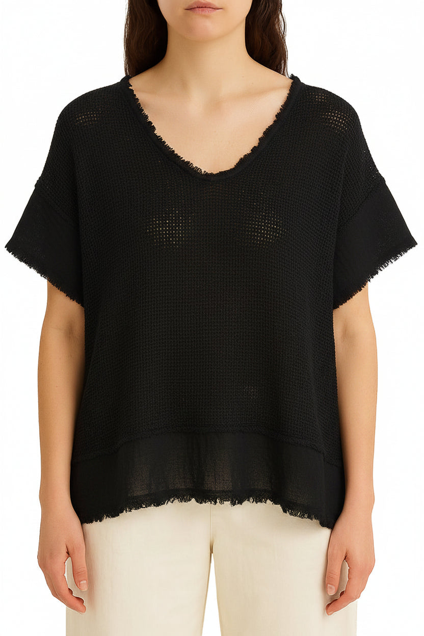 Ethereal mesh construction meets modern edge with this versatile short sleeve top. The delicate mesh fabric drapes beautifully while short bell sleeves add feminine movement. A rough-edge V-neckline and intentional distressed seam details on the sleeves and hemline create an effortlessly undone aesthetic. Layer it over a slip or wear solo for a contemporary look that balances elegance with edge.