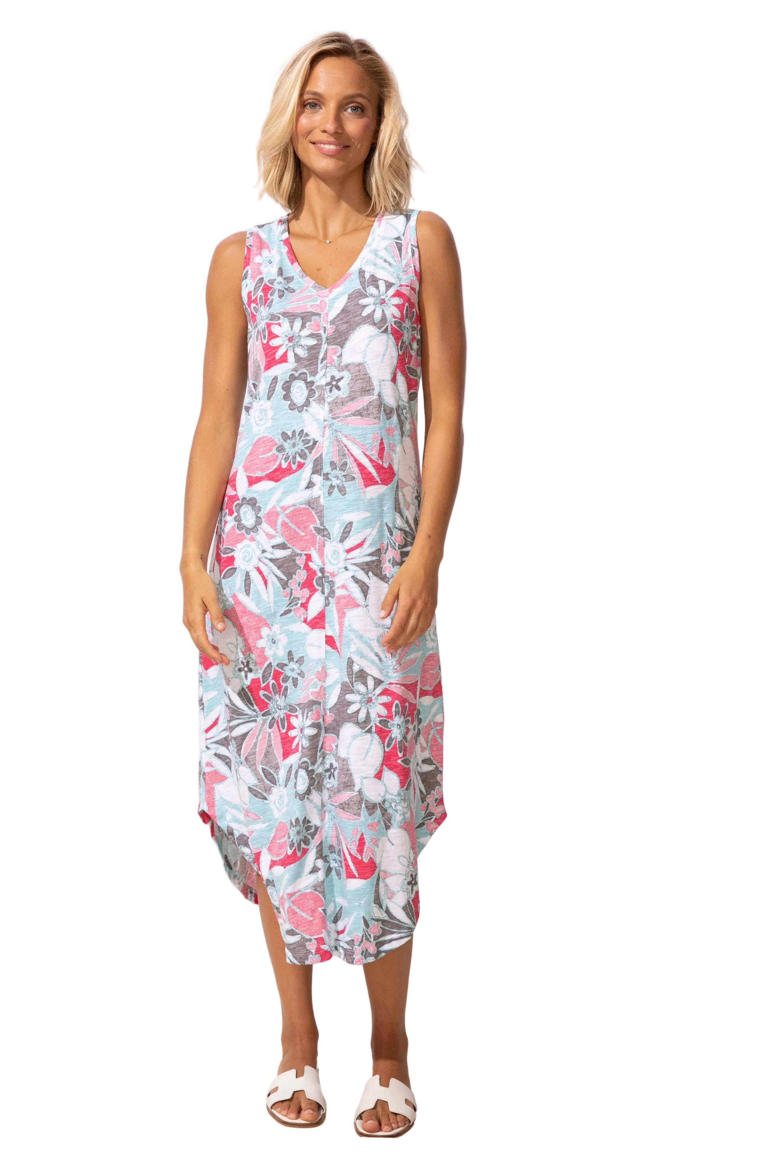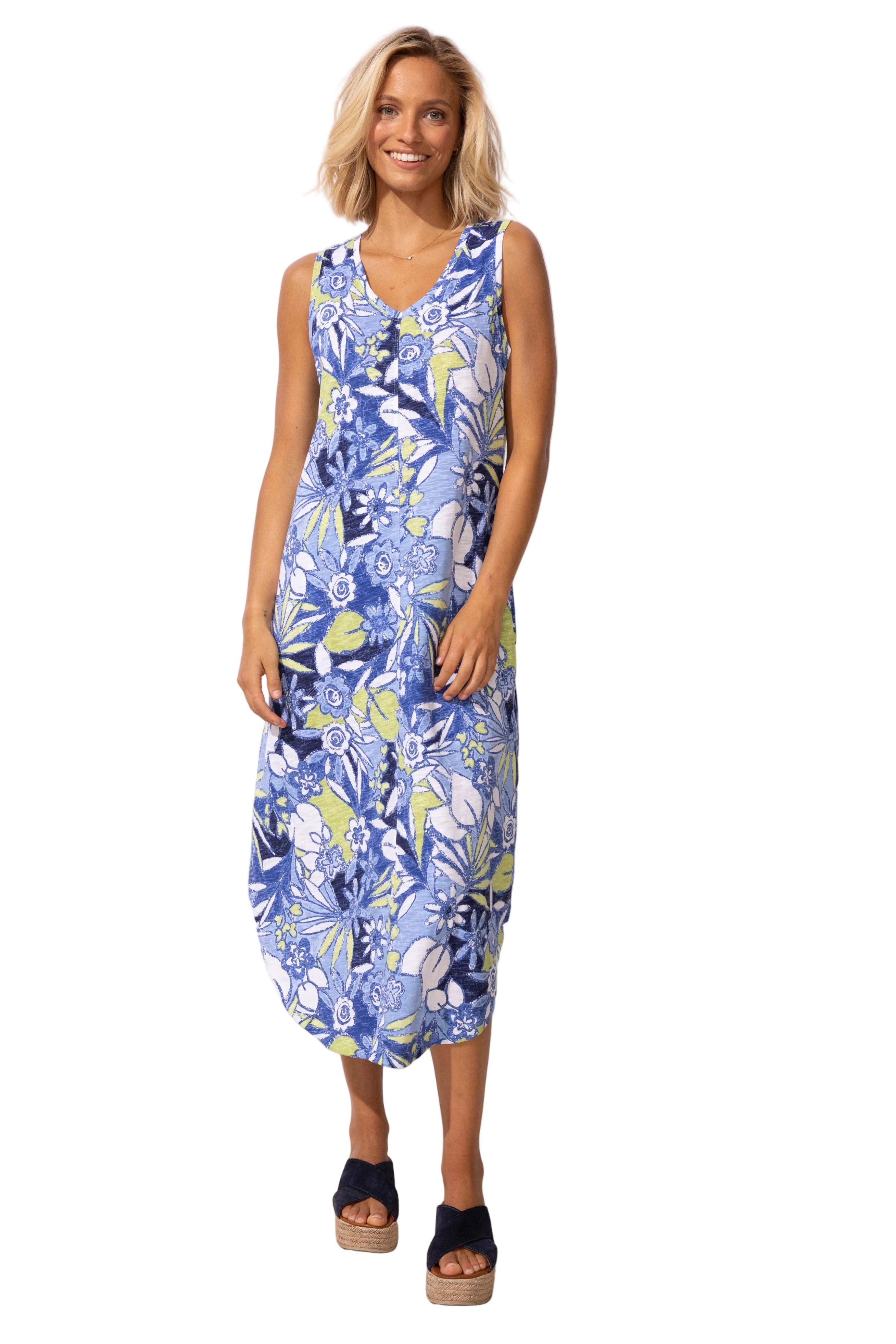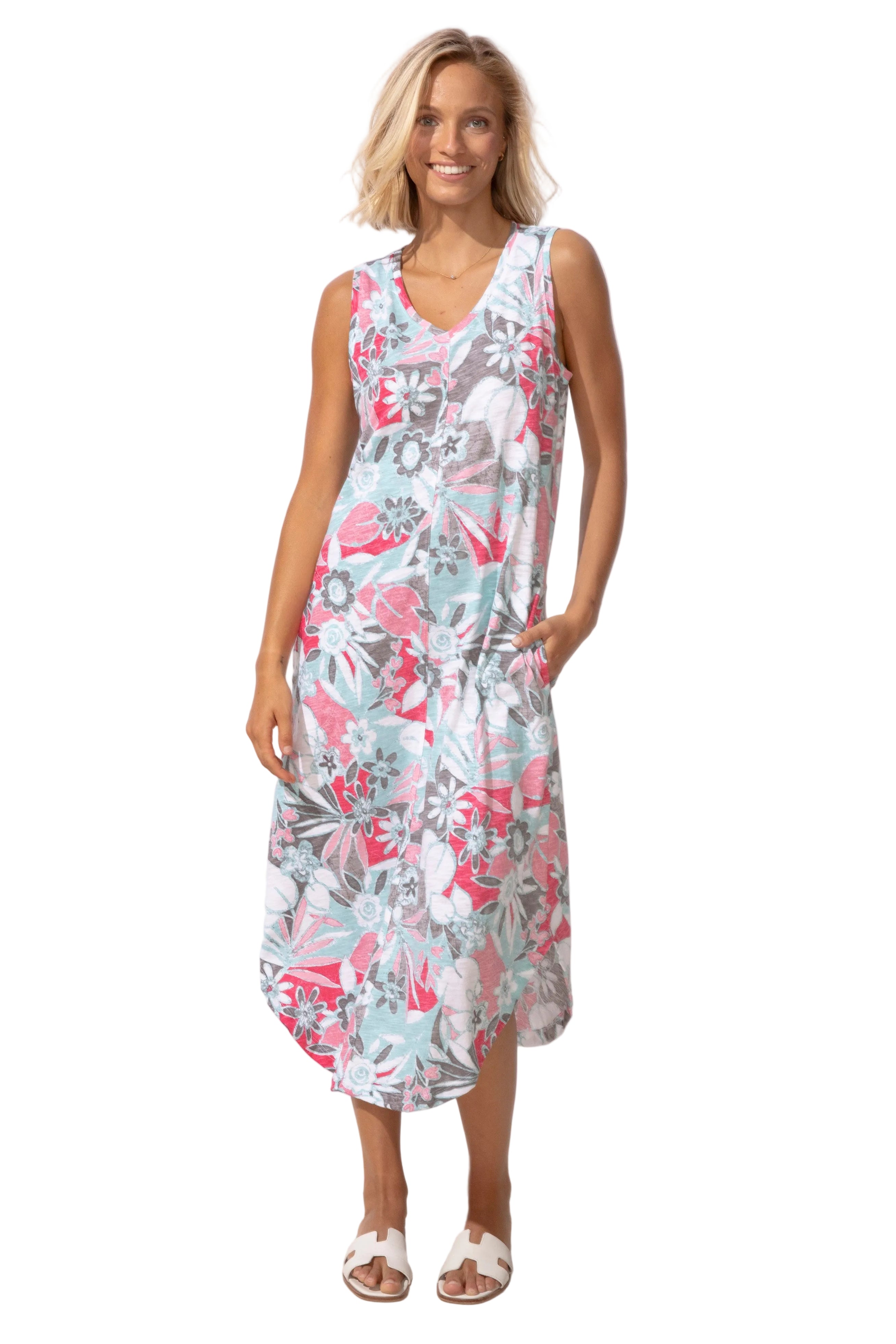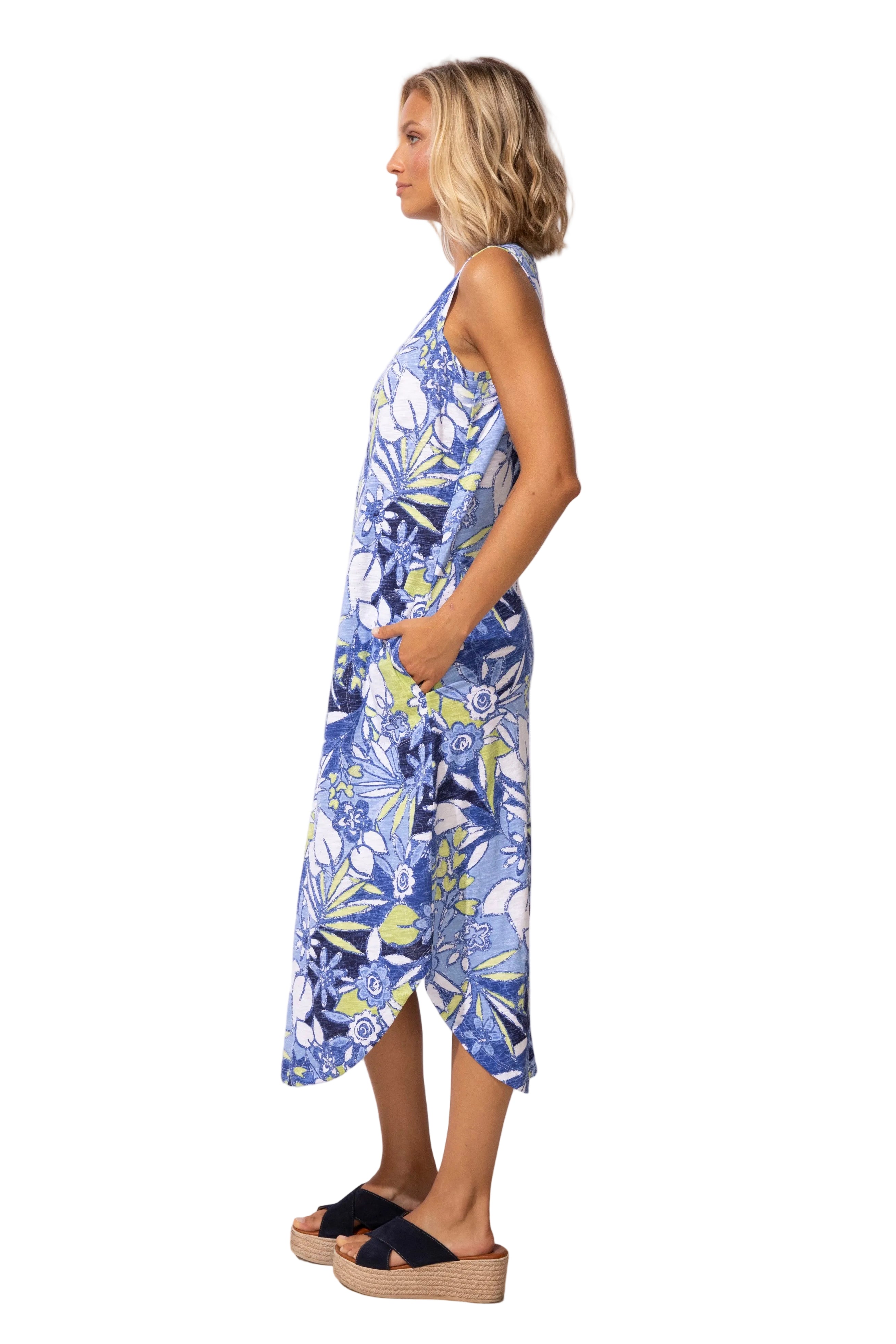 Embrace relaxed elegance with this charming sundress. Designed in soft cotton slub fabric, it features a timeless round neckline and sleeveless cut that lets you move freely. The midi length and rounded hem create a gentle, flattering silhouette, while the seamed front adds subtle structure and visual interest. Perfect for warm days, casual outings, or layering with your favorite cardigan—a wardrobe staple that feels as good as it looks.