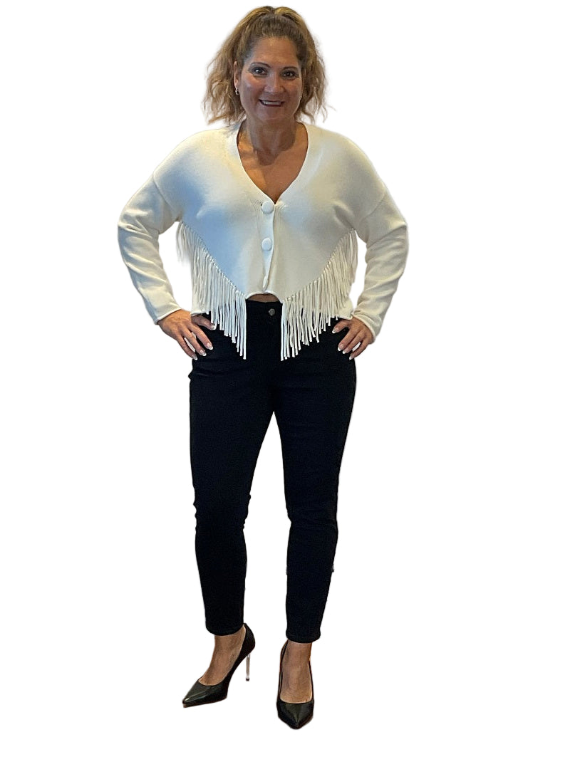 Elevate your wardrobe with the EternElle Fringe Front Top, a stylish cardigan featuring a flattering V-neck and long sleeves for all-day comfort. Its unique fringe detail at the front adds a touch of movement and texture, while the hi-low hemline creates a modern silhouette that pairs effortlessly with any outfit. Perfect for layering, this top blends everyday ease with standout style.