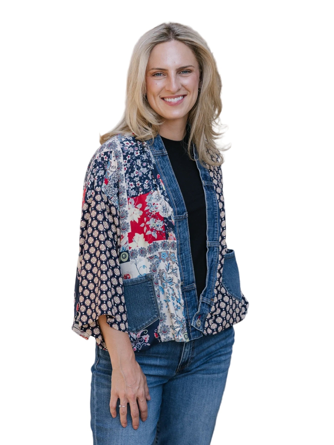 Introducing this Cardigan, designed by Shannon Passero! Elevate your style with 3/4 dolman sleeves and unique repurposed denim detailing. Keep your hands warm and essentials close with the added convenience of denim front pockets. Upgrade your wardrobe with this one-of-a-kind piece!