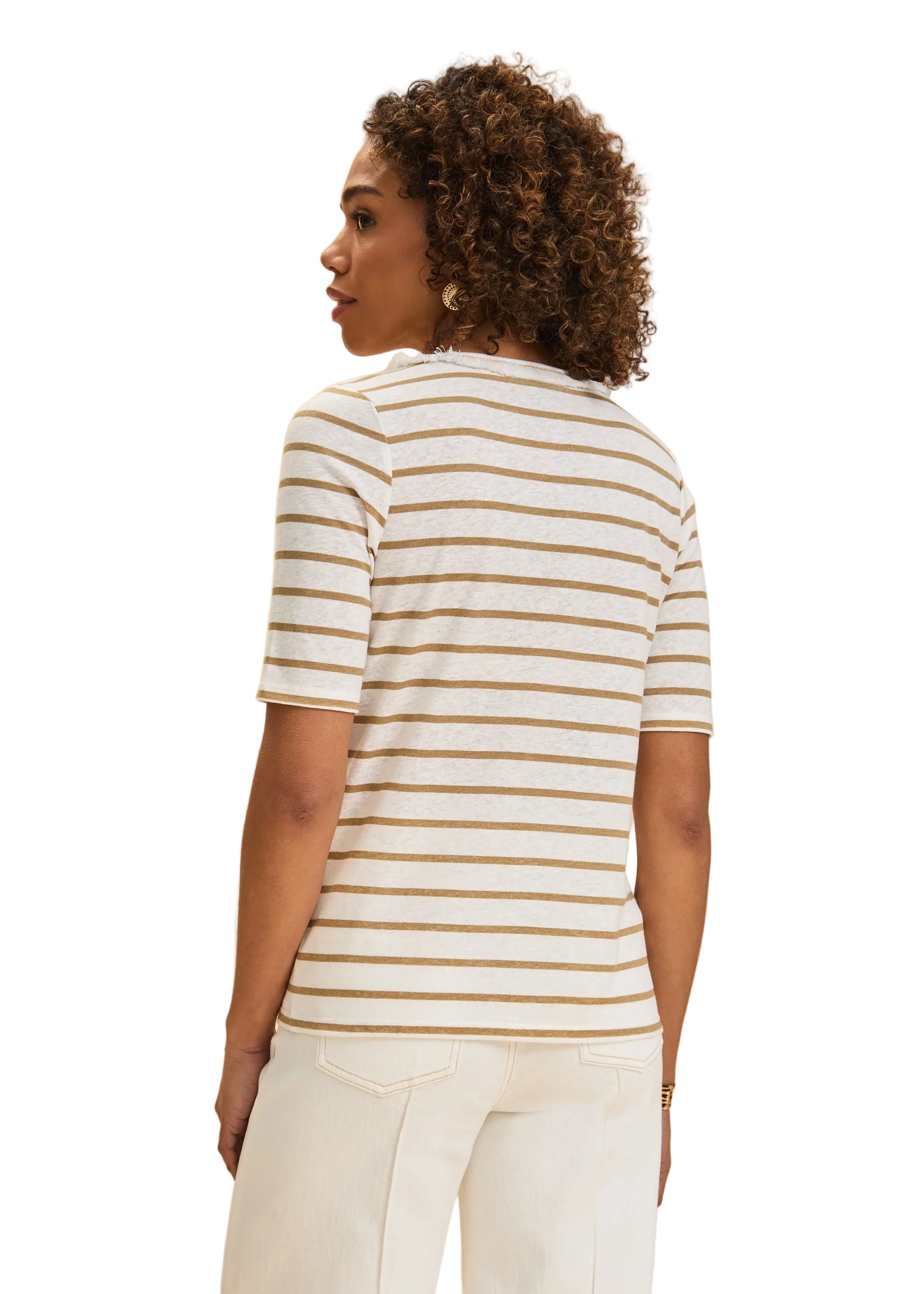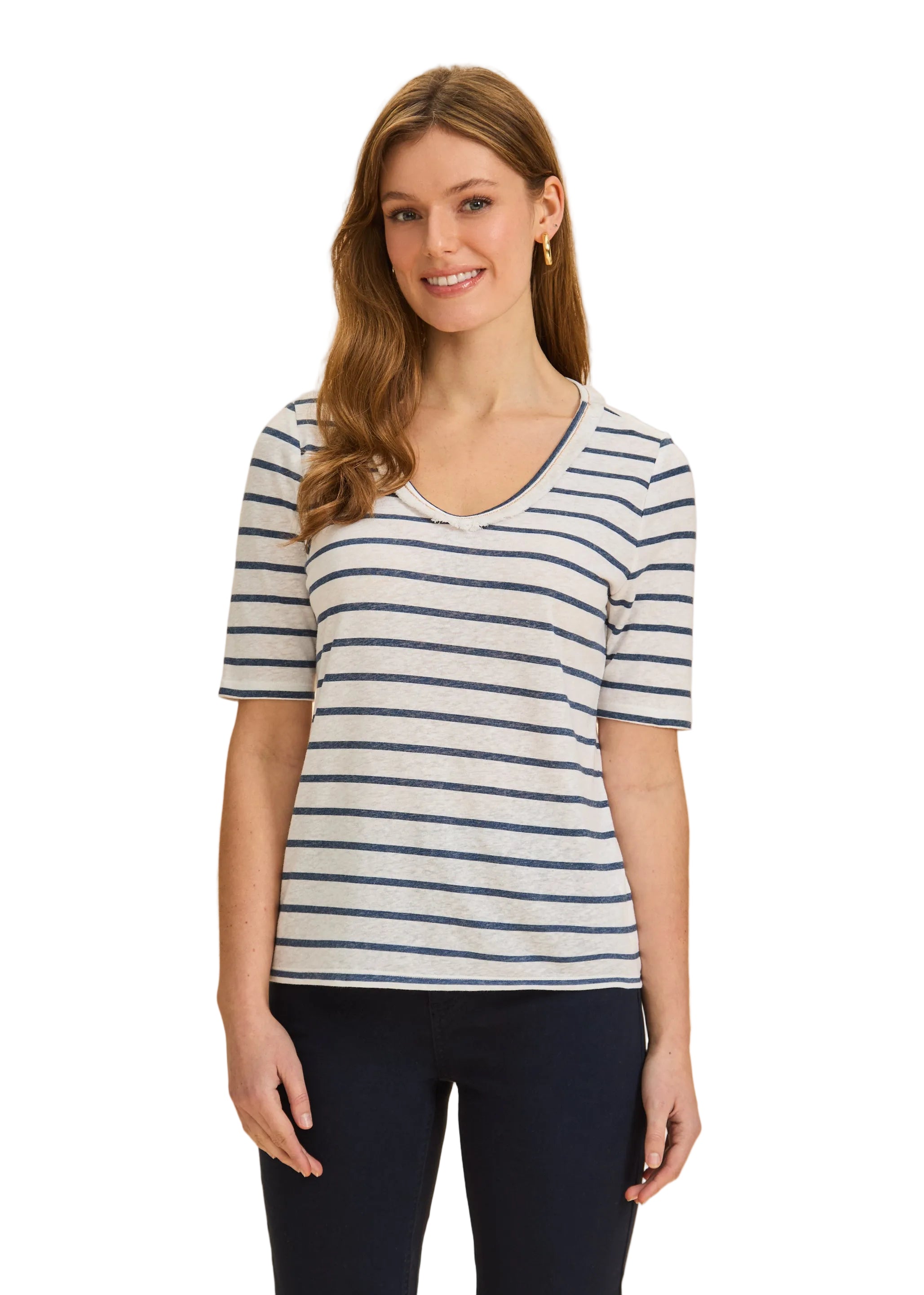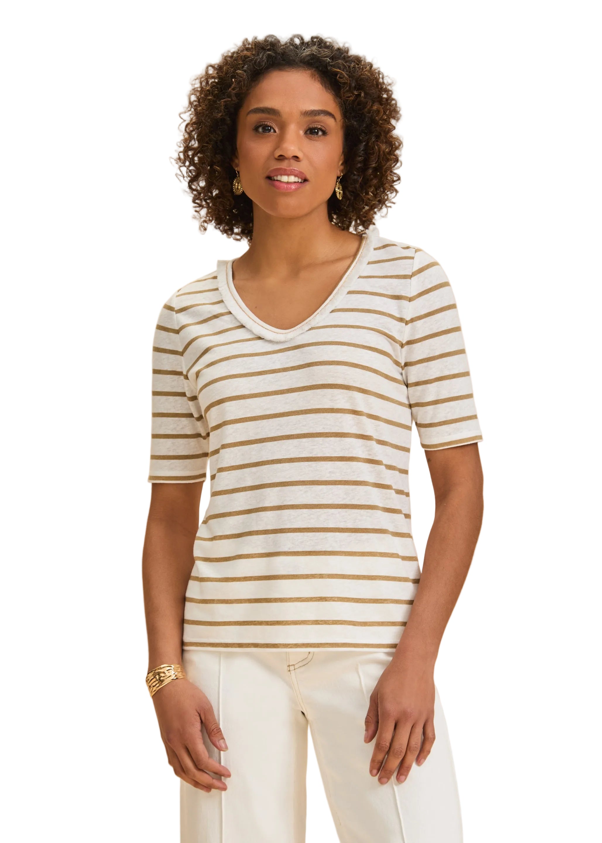 Effortless elegance meets playful edge with this FDJ linen jersey knit top. Crafted from breathable linen, it features a relaxed fit with elbow-length sleeves and a striped pattern that keeps things visually interesting. The standout detail? A charming fringe and bead-adorned neckline that adds movement and personality to every wear. Perfect for layering or wearing solo, this piece transitions seamlessly from casual days to evening outings with understated flair.