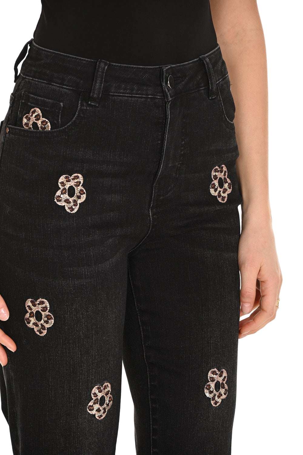 Elevate your style with the Frank Lyman Animal Daisy Jeans. Featuring a classic five-pocket design with bold leopard and sequin appliqué accents, these straight-leg jeans add a touch of fierce elegance to any look. Slight distressing enhances their edgy appeal, making them perfect for standing out while staying effortlessly cool.