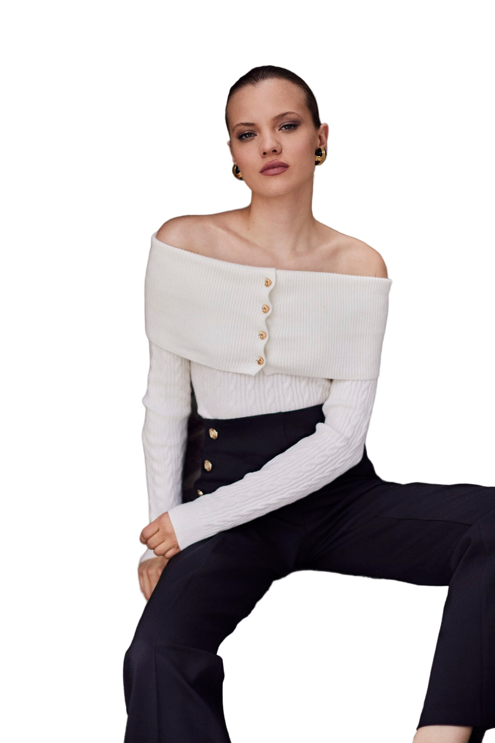 Frank Lyman Knit Sweater Designed for the modern sophisticate, this knit sweater balances structure with fluidity. The dual-position neckline—off-shoulder or pulled to the shoulder—creates a luxurious cowl effect that adapts to your styling mood. Button front detailing adds purposeful design, while the fitted silhouette and long sleeves deliver refined proportion. A versatile investment piece that transitions seamlessly from day to evening.