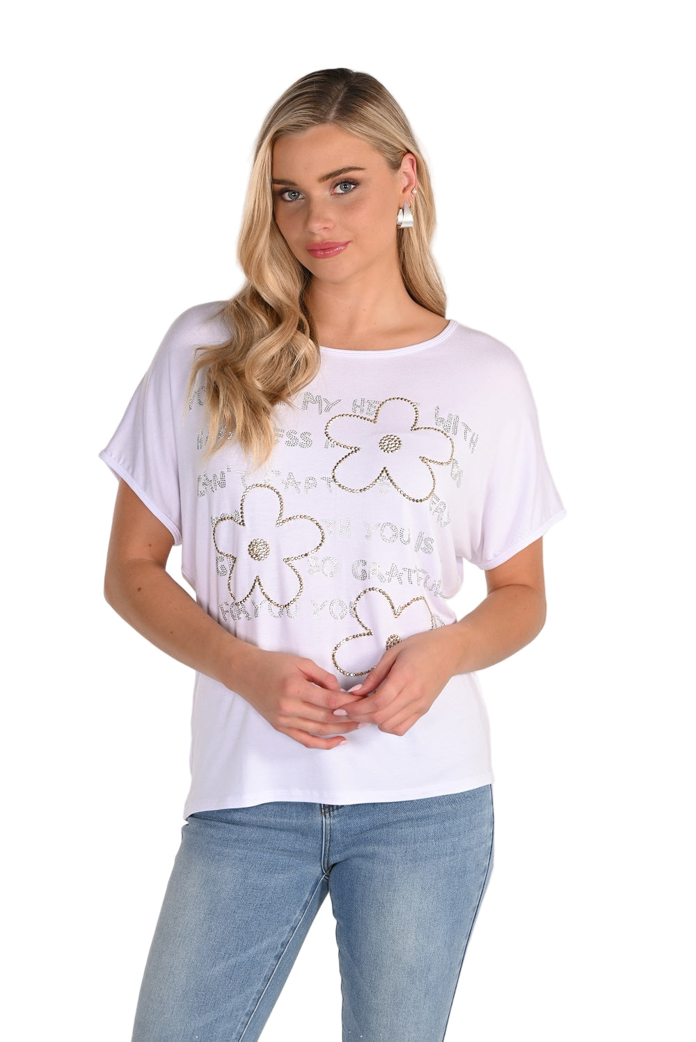 Effortless elegance meets modern edge with this Frank Lyman tee. The relaxed drop shoulder and flowing dolman sleeves create a breezy, laid-back silhouette that moves with you, while the shimmering rhinestone graphic adds just the right amount of sparkle. Round neckline keeps it casual and versatile—dress it up with tailored trousers or keep it cool with your favorite jeans. A wardrobe staple that doesn't take itself too seriously.