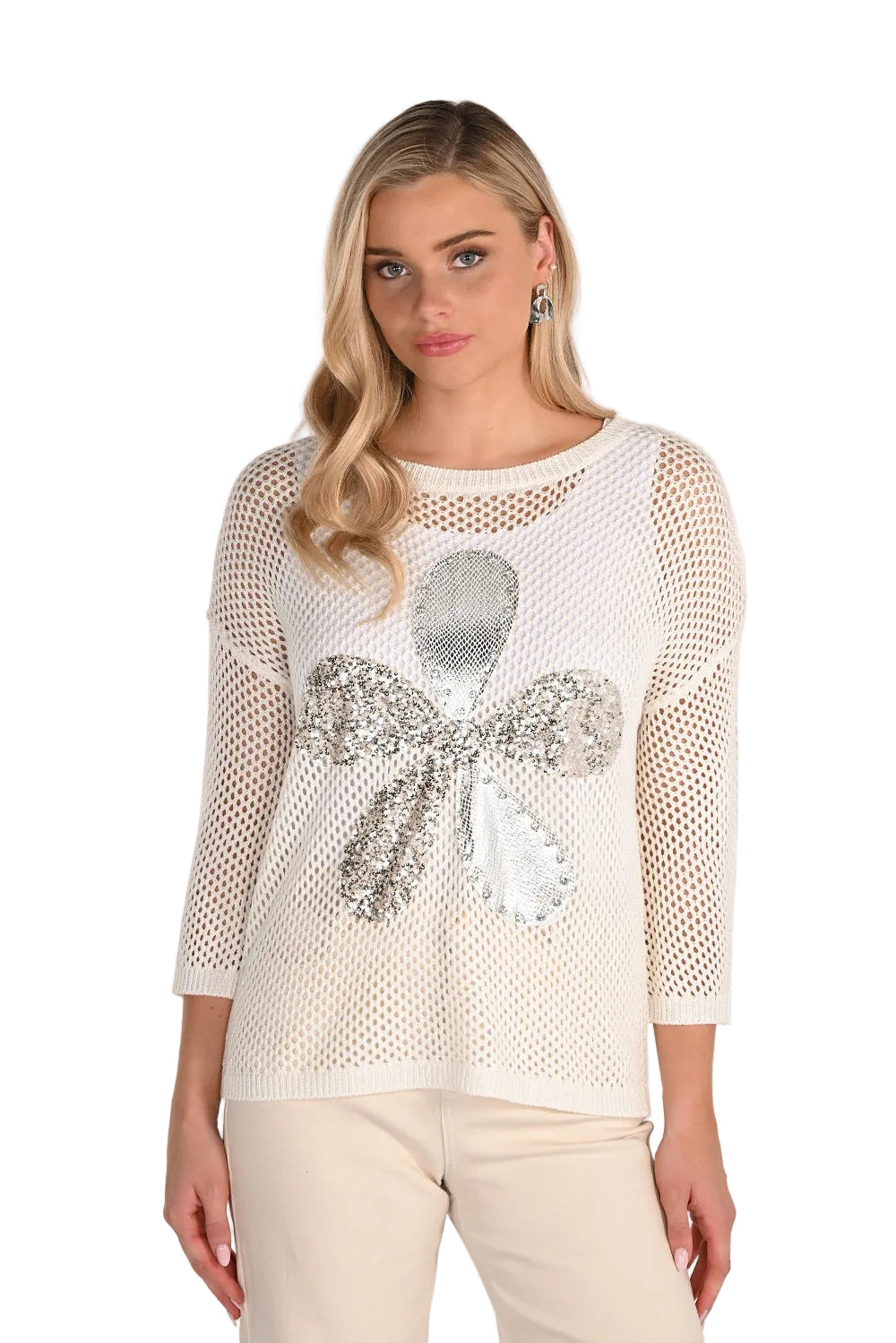 Throw on some sparkle with this Frank Lyman crochet mesh sweater—a breezy layer that's equal parts chic and fun. The round neckline and long sleeves offer effortless coverage, while sequin florals dance across the delicate mesh for a touch of glam. Whether you're dressing up a simple tank or adding dimension to an evening look, this versatile piece is your new go-to for instant personality. Light, airy, and absolutely charming.