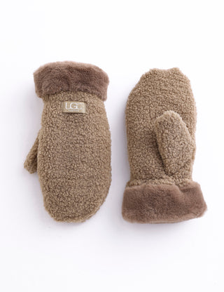 Woman wearing a white vest, beige sweater, and brown mittens against a light background