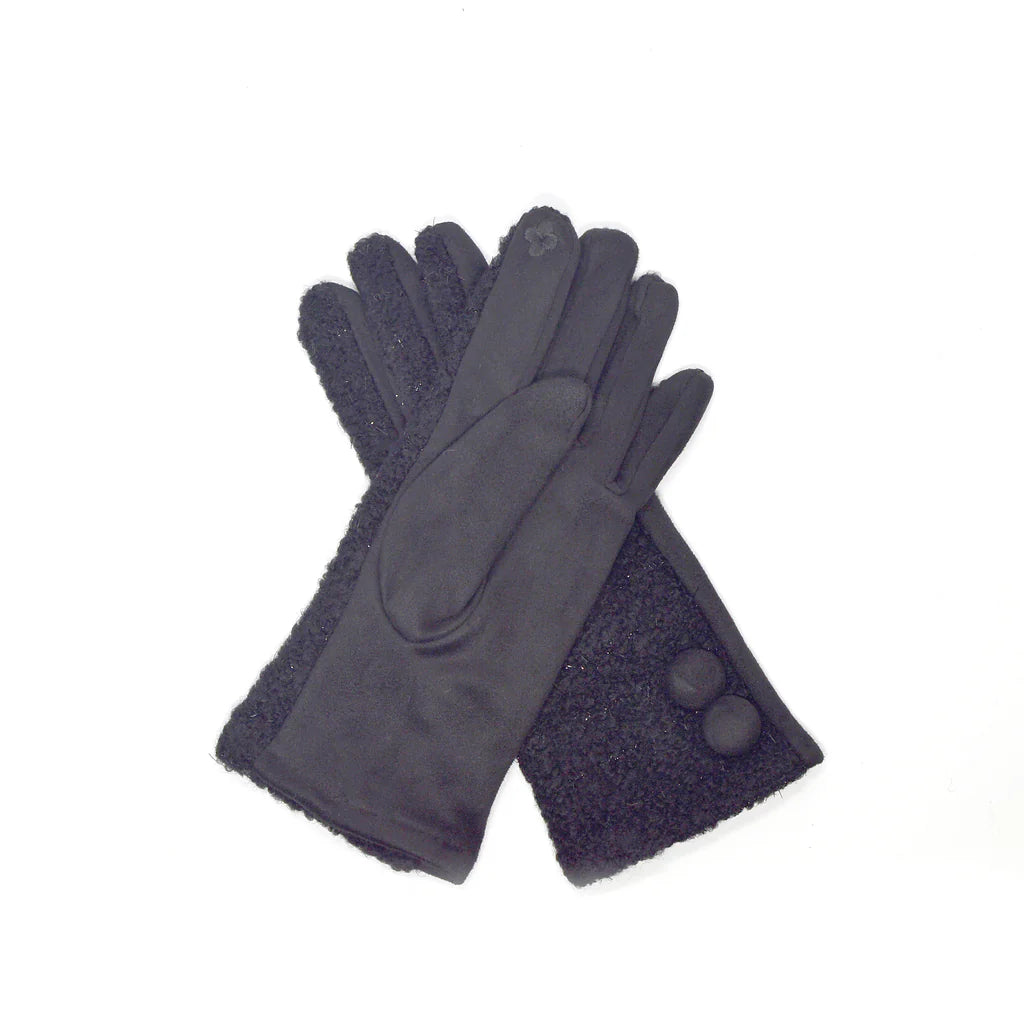 Discover the perfect balance of warmth and refinement with these statement gloves. Crafted with a plush fuzzy knit exterior featuring eye-catching lurex flecks, they deliver both texture and shimmer. The reinforced faux suede palm offers practical grip and lasting wear, while decorative faux suede button details add a touch of curated elegance. Designed for those who refuse to compromise on style, these gloves transform a functional accessory into a fashion-forward essential that completes any ensemble.