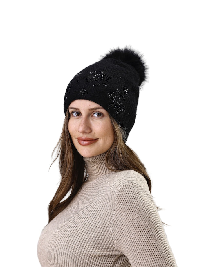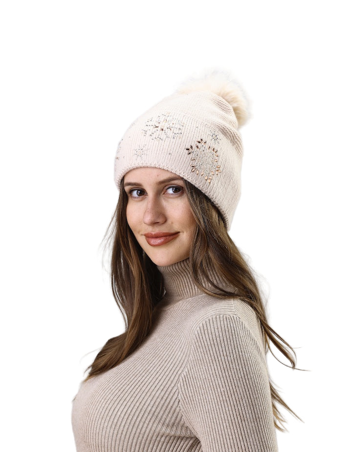 Elevate your winter wardrobe with this refined knit beanie, adorned with shimmering rhinestone snowflakes that catch the light with understated elegance. The plush faux fur pom pom adds a luxe finishing touch, balancing contemporary design with timeless appeal. Perfect for those who refuse to compromise on style during the colder months.