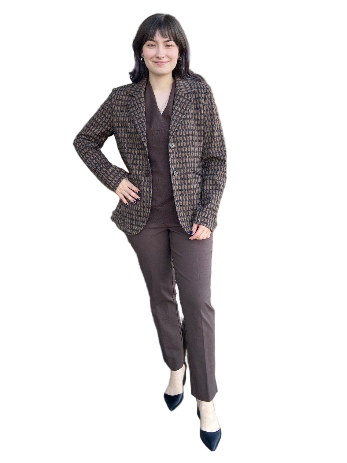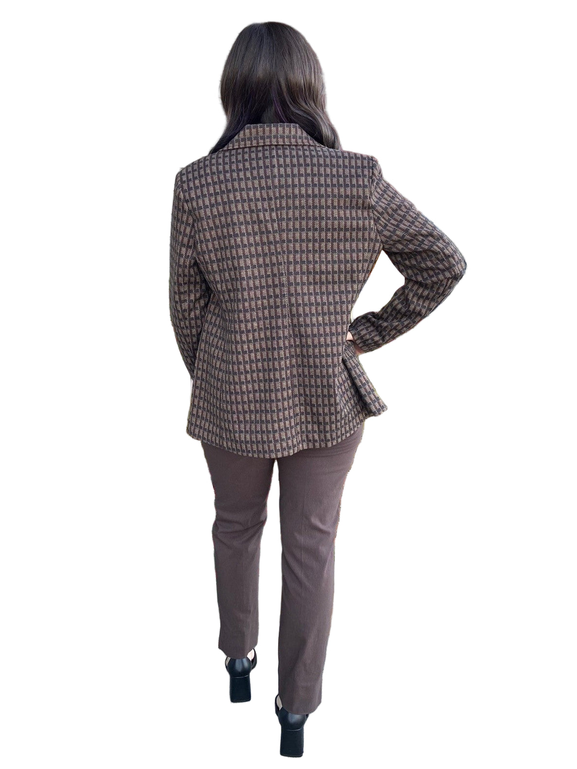 The Atelier Geo Jacquard Jacket features a classic collared design with long sleeves for timeless style and comfort. Its double button closure ensures a secure fit, while hidden front placard pockets offer practical storage without interrupting the sleek silhouette. Expert darting at the front shapes the jacket to flatter your figure, making it an elegant and versatile addition to your wardrobe. Perfect for elevating both casual and professional looks.