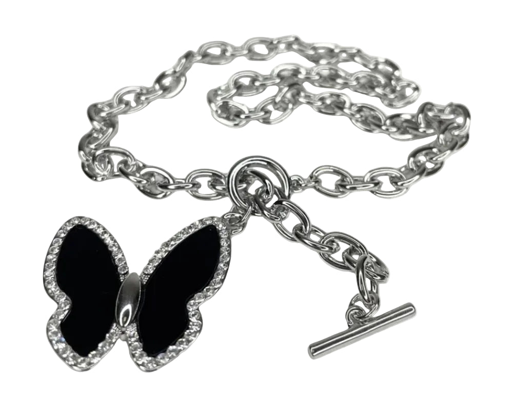 Elevate your everyday style with this stunning dual-sided necklace from Jacqueline Kent. One side features a glamorous black onyx butterfly adorned with sparkling rhinestones, while the flip side offers a refined, understated design perfect for any occasion. Set against a polished silver background, this versatile piece transitions seamlessly from day to night. The necklace is strung on a classic silver round link chain and secured with a convenient bar toggle closure—a timeless accessory that celebrates your multifaceted style.
