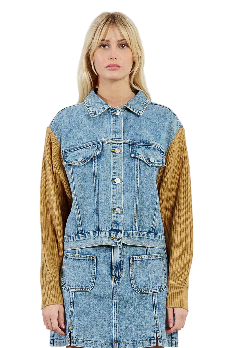 The Lilli Sidonio Ladies Woven Jacket combines denim and ribbed knit for a versatile, stylish look. Featuring long ribbed sleeves and a classic shirt collar, it offers both comfort and edge. Large buttoned flap pockets add practical flair, while the full-length metal button closure and topstitching detail enhance its sophisticated appeal. Perfect for elevating your everyday wardrobe with a polished yet casual vibe.
