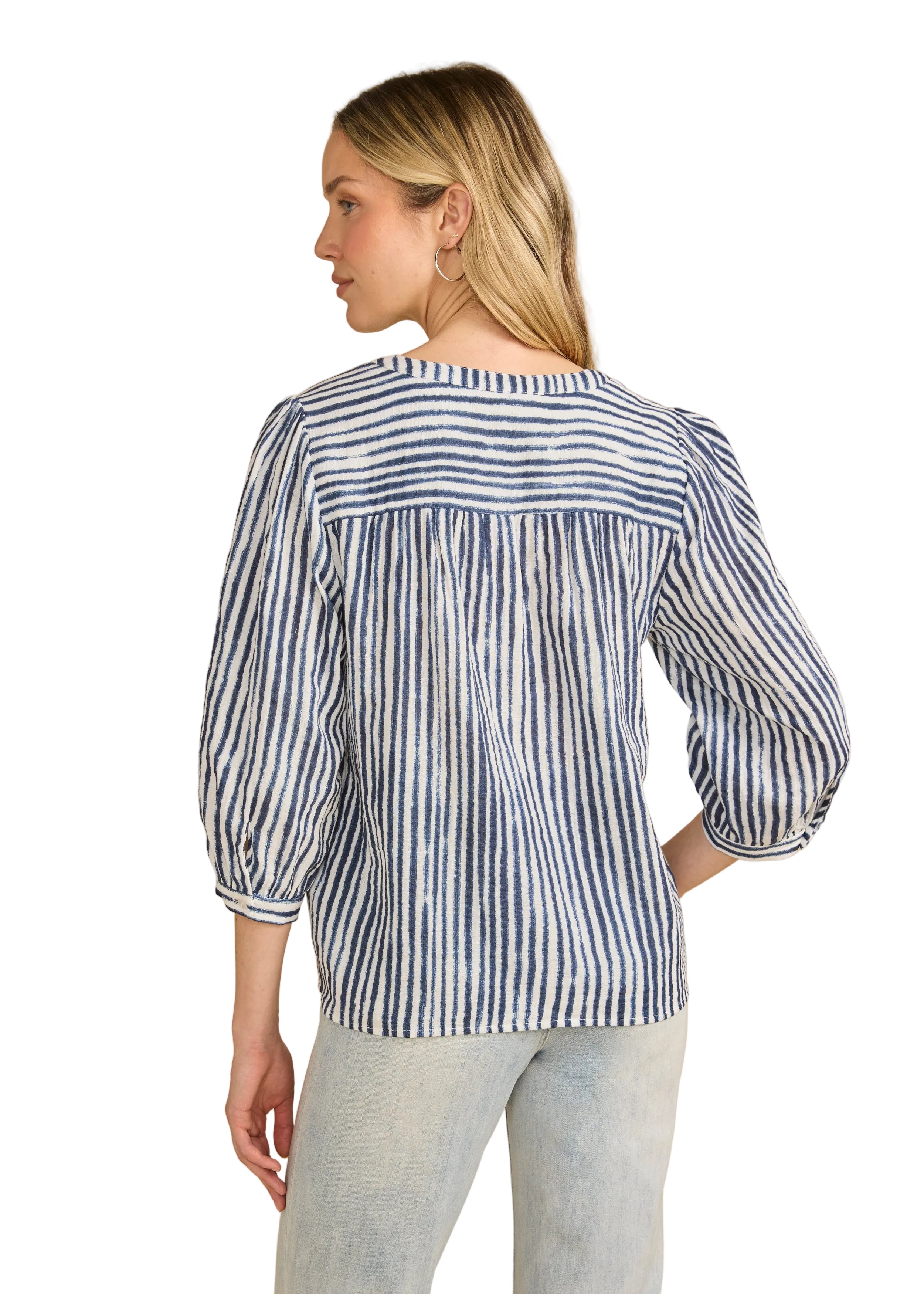 Effortless elegance meets comfort in this FDJ Double Gauze Popover Blouse. Crafted from breathable cotton gauze, it features a notched V-neckline and charming balloon sleeves that add movement and dimension. The 3/4 sleeve length and striped pattern make it versatile enough for casual days or layered styling. Perfect for warm-weather dressing with a relaxed, sophisticated appeal.
