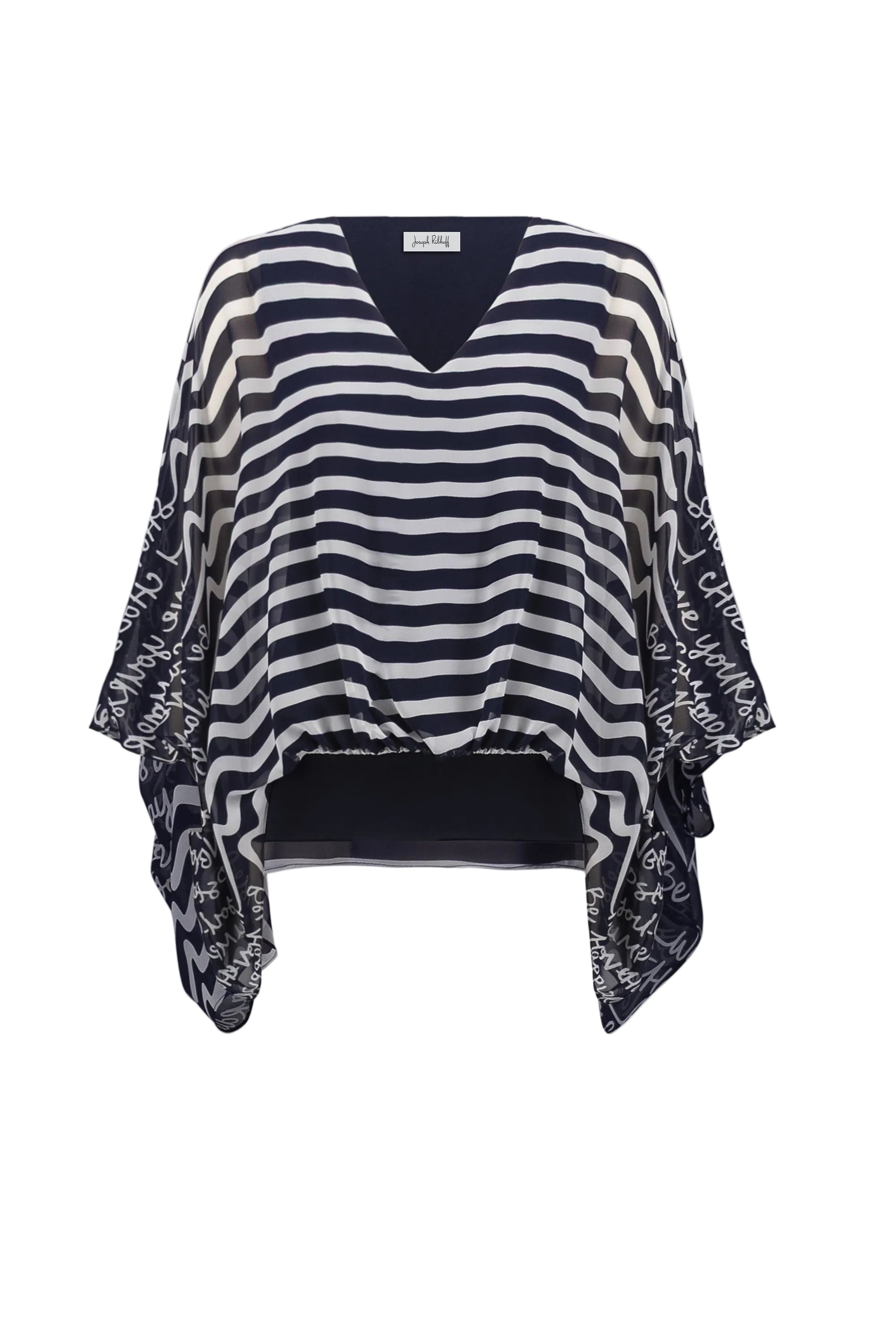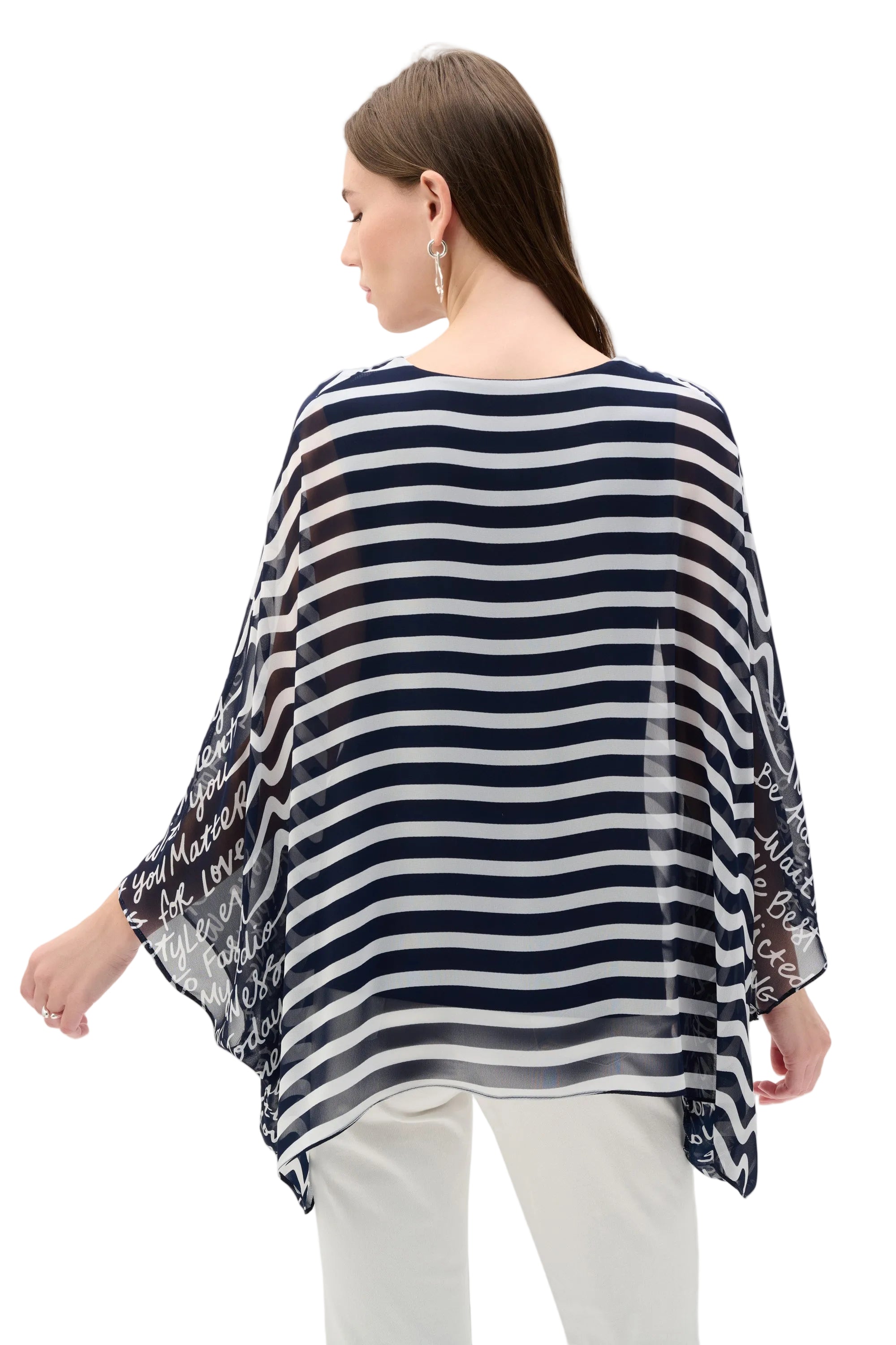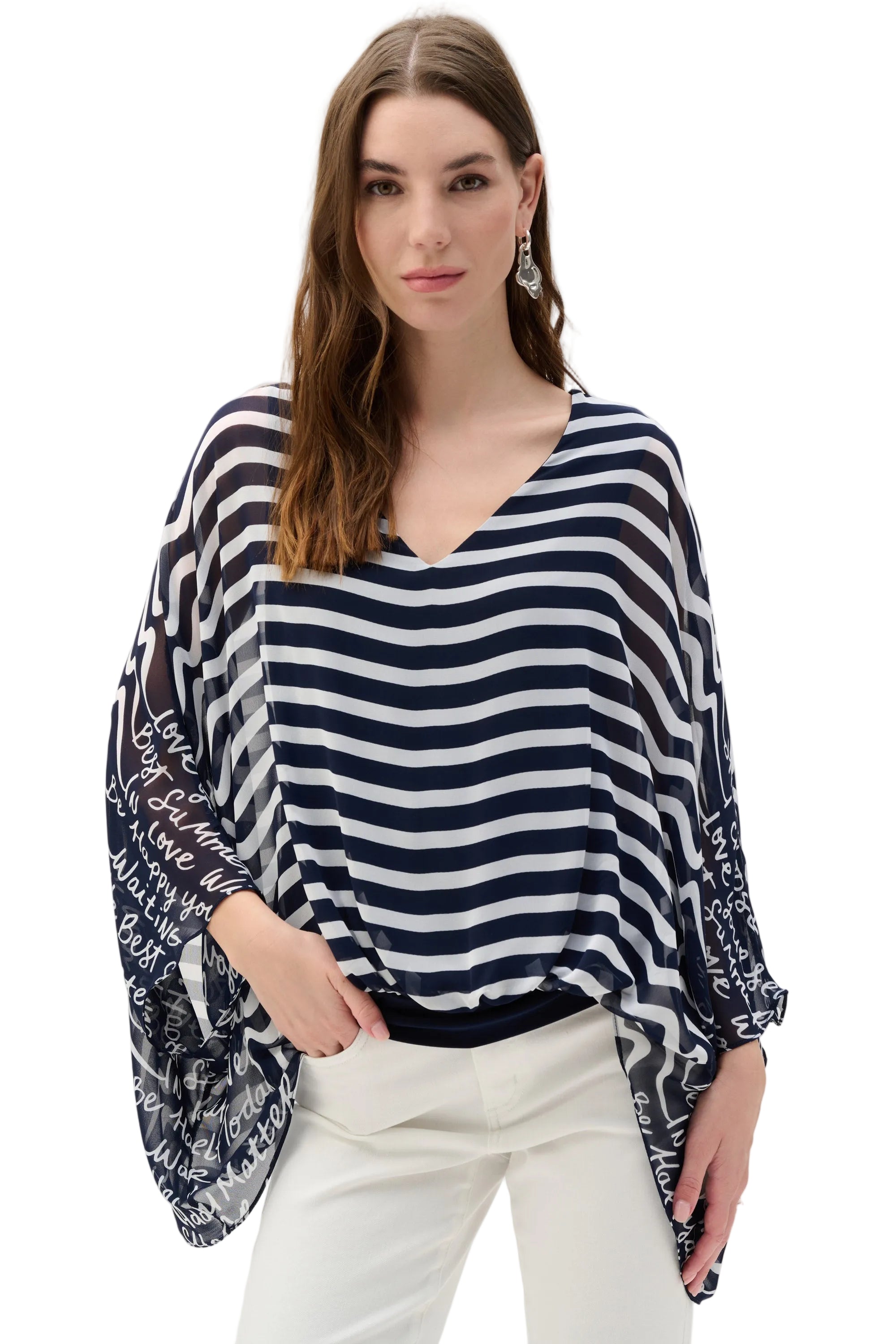 Effortless elegance meets playful style with this Joseph Ribkoff poncho top. Featuring a lightweight chiffon layer with a charming conversational print, it drapes beautifully over a silky knit cami for a sophisticated layered look. The flattering V-neckline and three-quarter statement sleeves create dimension, while the blouson front adds movement and visual interest. Fully lined for comfort and confidence. Perfect for transitional seasons and versatile enough to dress up or down.