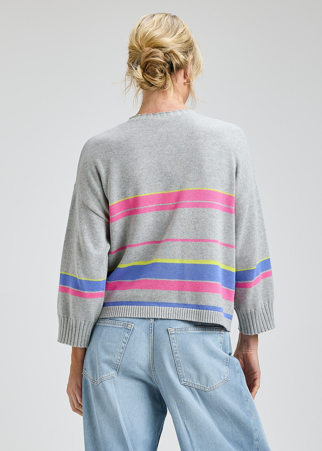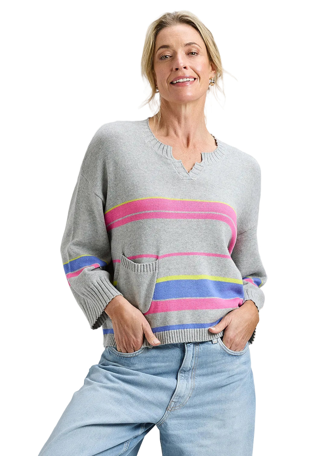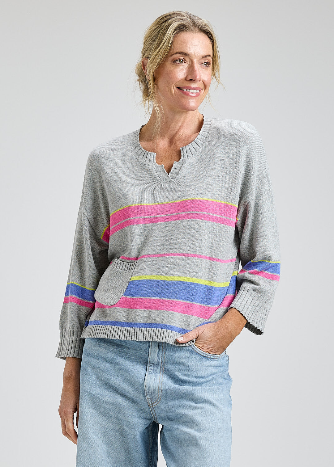 Elevate your casual wardrobe with this charming crop sweater, designed with thoughtful details that blend comfort and style. The notched V-neckline creates a flattering silhouette, while ribbed accents at the neck, sleeves, and hemline provide a polished finish. A functional front pocket adds everyday practicality, finished with ribbed detailing for visual interest. The striped print brings a fresh, versatile look that pairs effortlessly with your favorite bottoms. Perfect for layering or wearing solo, this piece brings together quality construction and modern design.