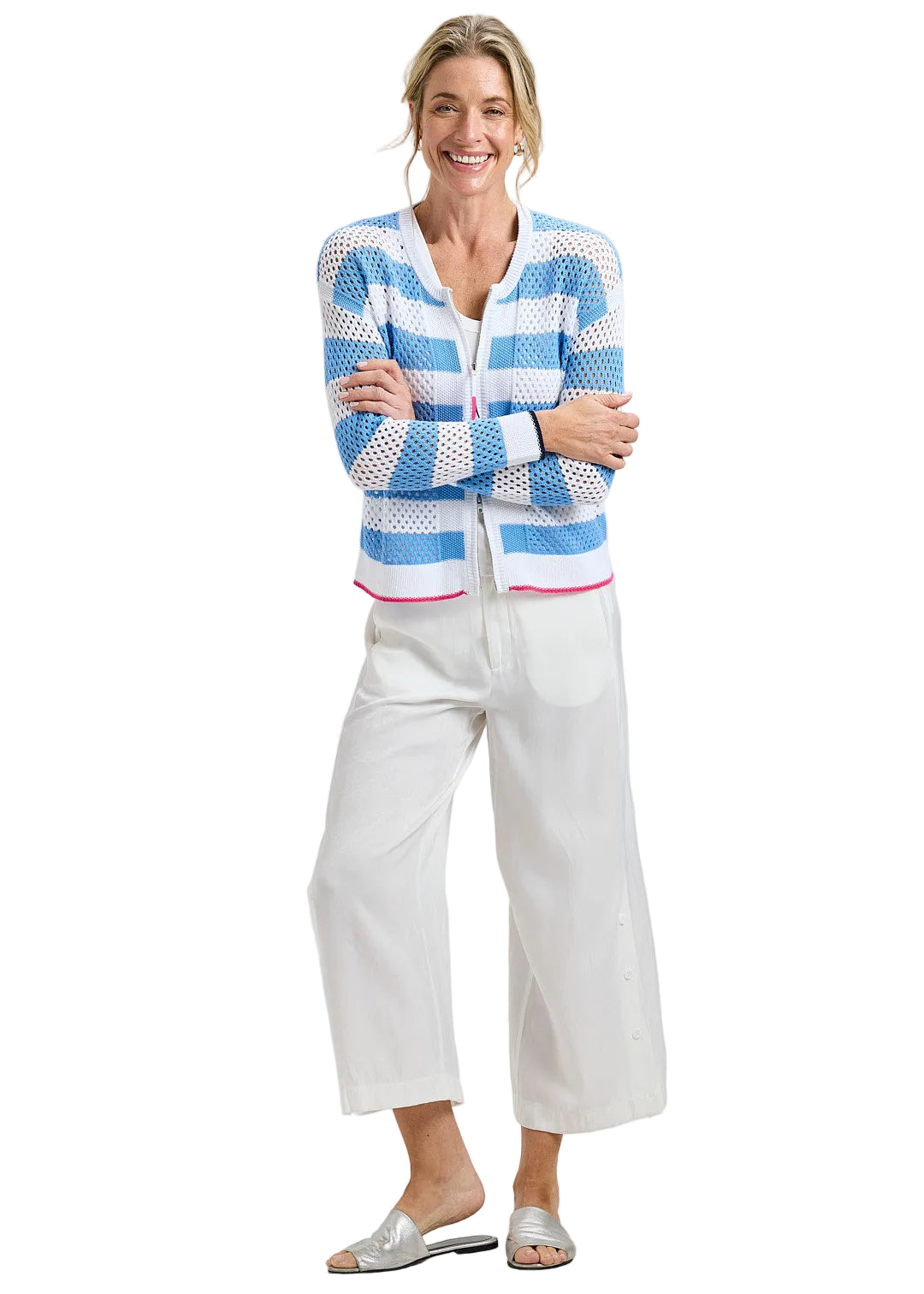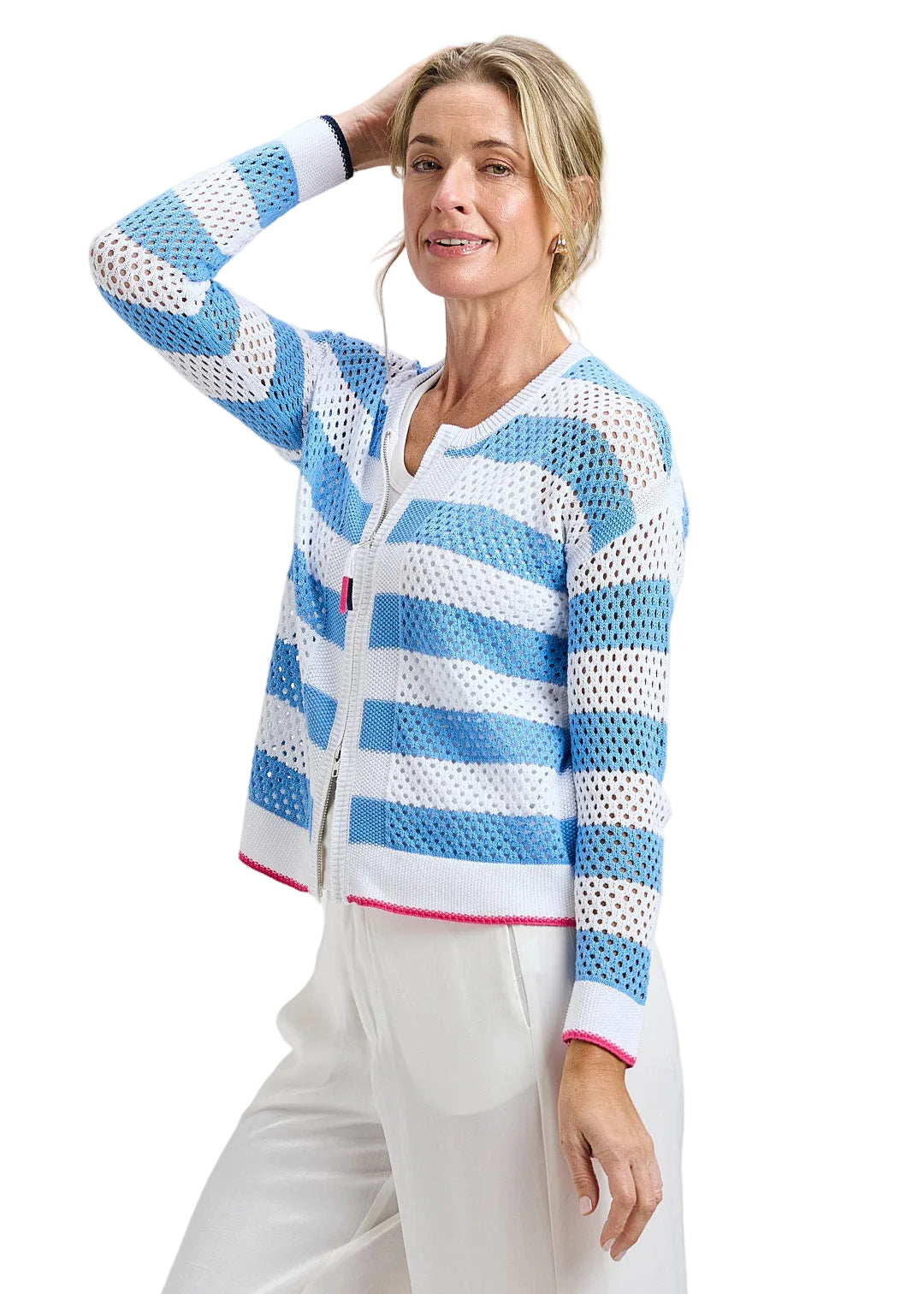 Effortlessly layer this pointelle zip cardigan for a polished, versatile look. Featuring a lightweight construction and classic striped design, it's perfect for transitional seasons when you need just the right amount of warmth. The convenient zipper closure makes it easy to adjust your comfort throughout the day, while the refined pointelle knit adds subtle texture and visual interest. A wardrobe essential that pairs beautifully with everything from casual tees to dresses, giving you endless styling possibilities.