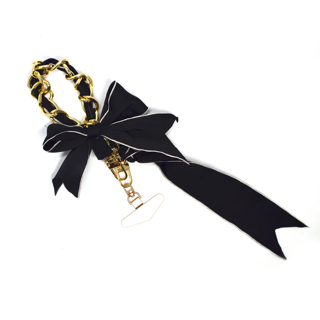 Elevate your everyday carry with this striking phone charm that merges luxury and playfulness. A delicate gold chain intertwines with a sleek black ribbon, crowned with an elegant bow detail that catches light and attention. Perfect for personalizing your device while adding a touch of sophisticated charm to your daily routine. A versatile accessory that transitions seamlessly from casual to refined.