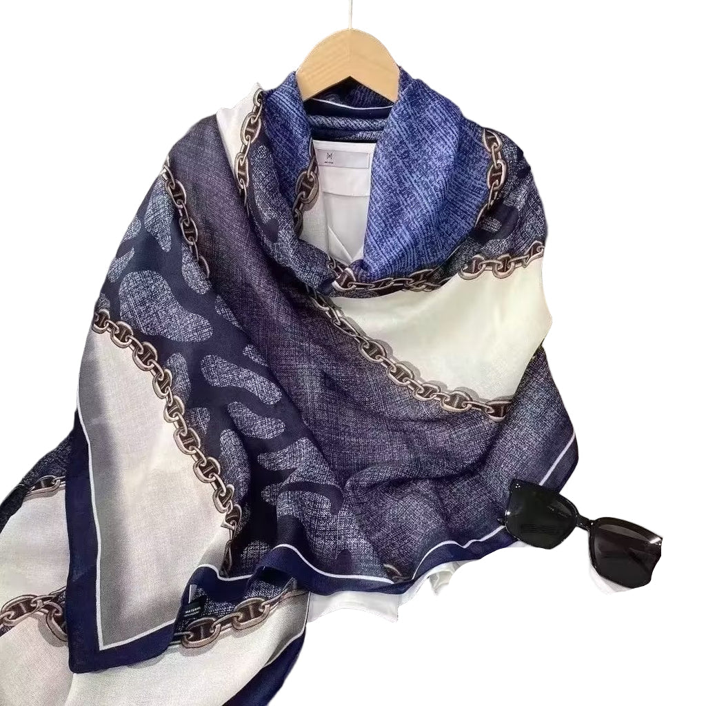 Effortlessly elevate any outfit with this lightweight Luv & Co. nautical scarf. Featuring a sophisticated palette of navy, rich cream, and gleaming gold chain print, it drapes beautifully at length without adding bulk. Perfect for layering over dresses, wrapping around your shoulders, or styling as a chic accessory—this versatile piece brings coastal elegance and timeless refinement to your everyday wardrobe.