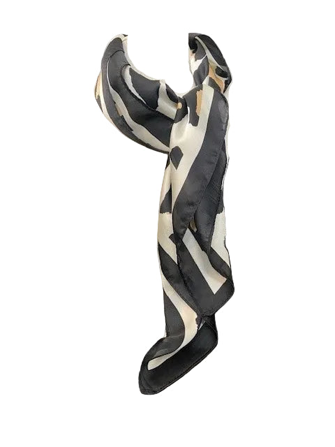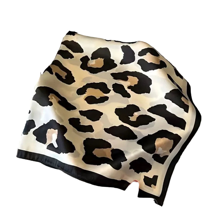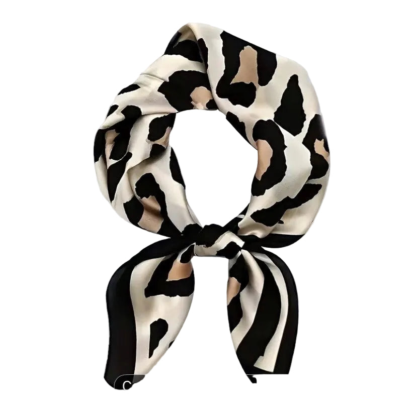 Wrap yourself in wild elegance with this versatile scarf. Featuring a striking leopard print in cream with bold black accents, this 26-inch square is your go-to accessory for endless styling possibilities. Wear it as a chic head scarf, drape it around your neck, or throw it over your shoulders for an instant fashion moment. Crafted from luxurious silk, it's the perfect blend of bold pattern and refined texture that takes any outfit from ordinary to extraordinary.