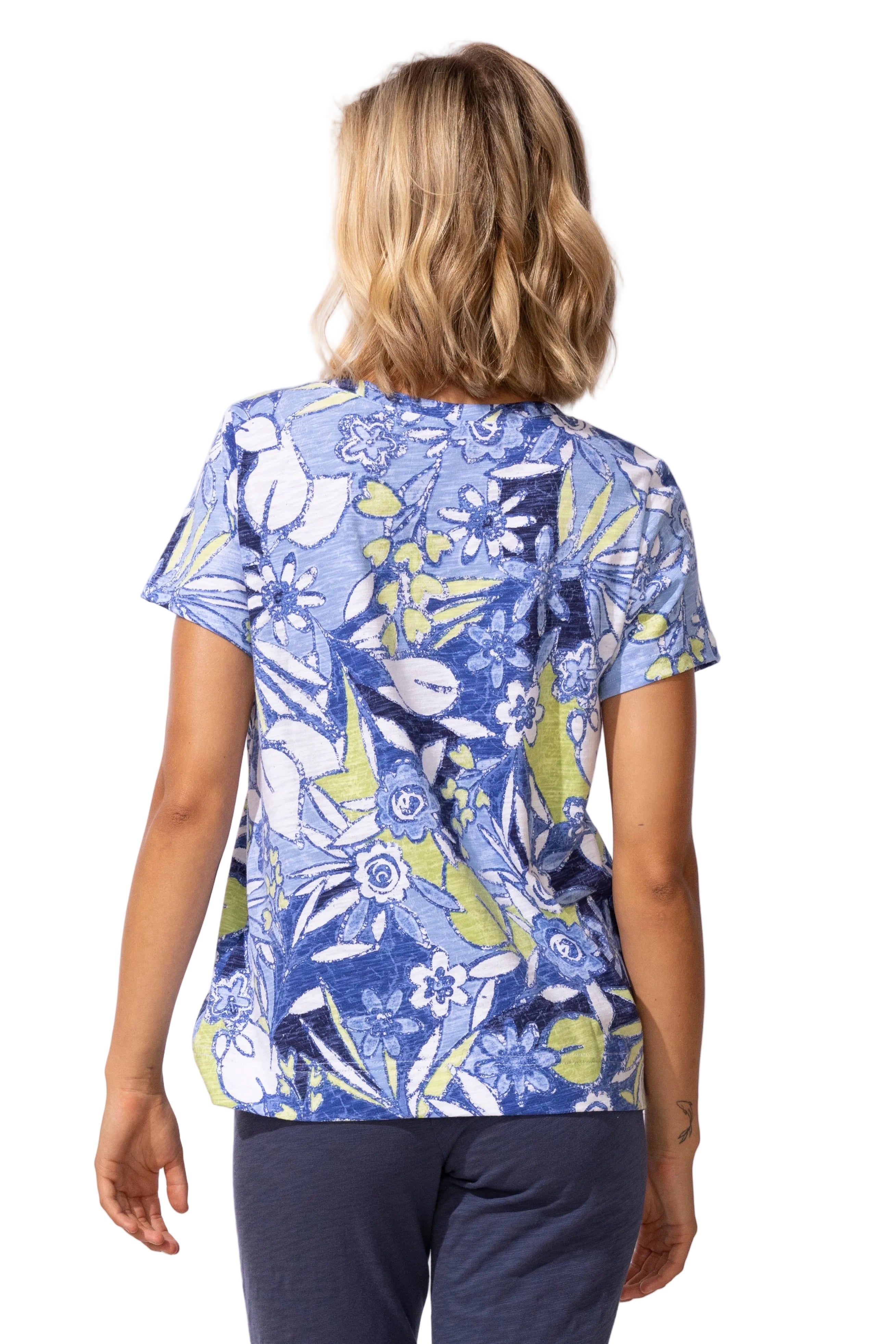 Embrace effortless style with this charming tropical print tee. Crafted from soft cotton slub fabric, it offers a relaxed, textured feel that's perfect for warm-weather days. The flattering v-neckline and short sleeves create a versatile silhouette that works beautifully on its own or layered under your favorite pieces. Whether you're heading to the beach or enjoying a casual weekend, this floral design brings a touch of paradise to your everyday wardrobe.