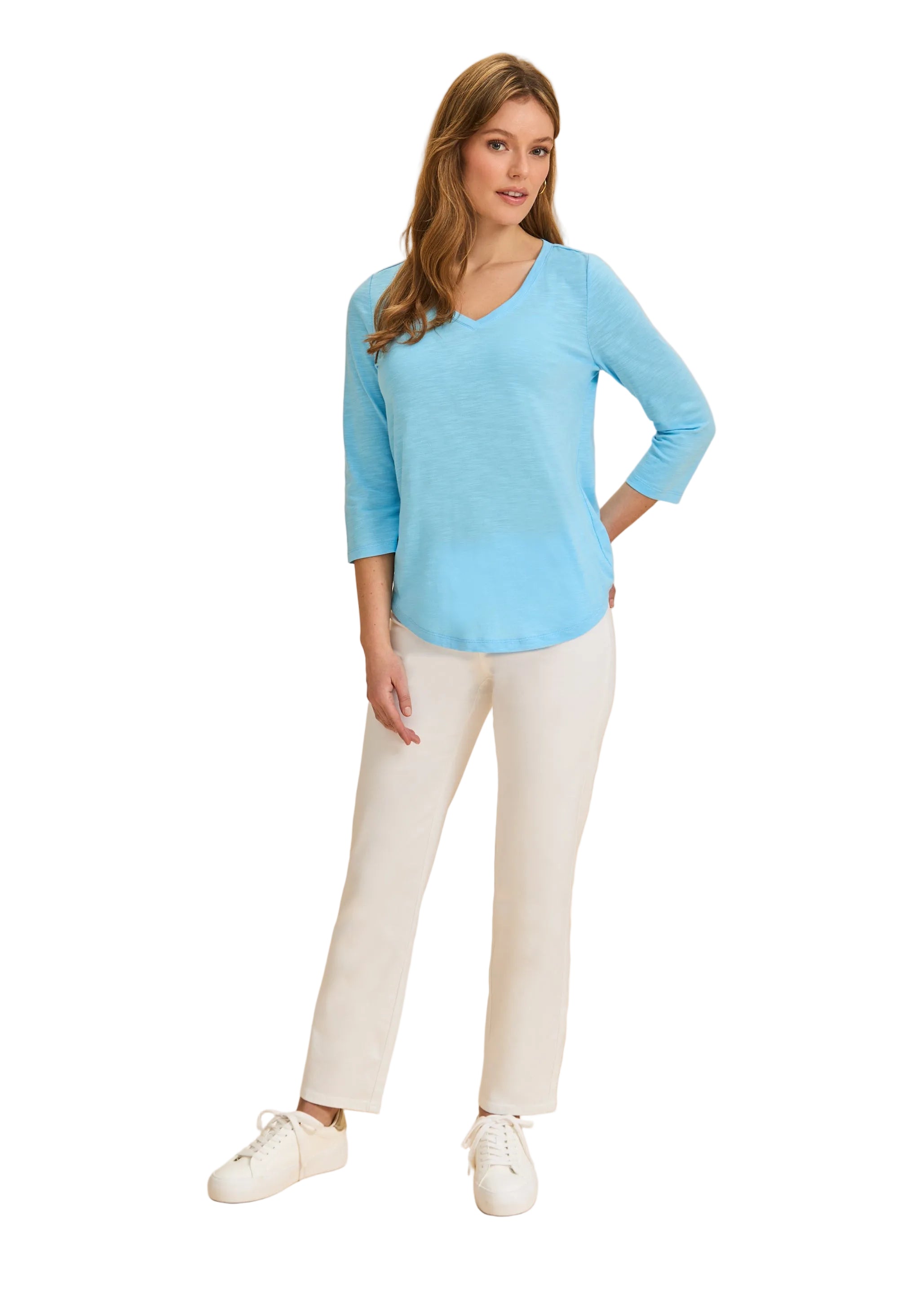 Effortless elegance meets everyday comfort in this FDJ V-neck top. The relaxed 3/4 sleeves and lightweight jersey fabric make it perfect for layering or wearing solo, while the rounded hemline adds a flattering, modern touch. Versatile enough for casual outings or dressed up for something special—this piece is your new go-to for looking put-together without trying too hard.