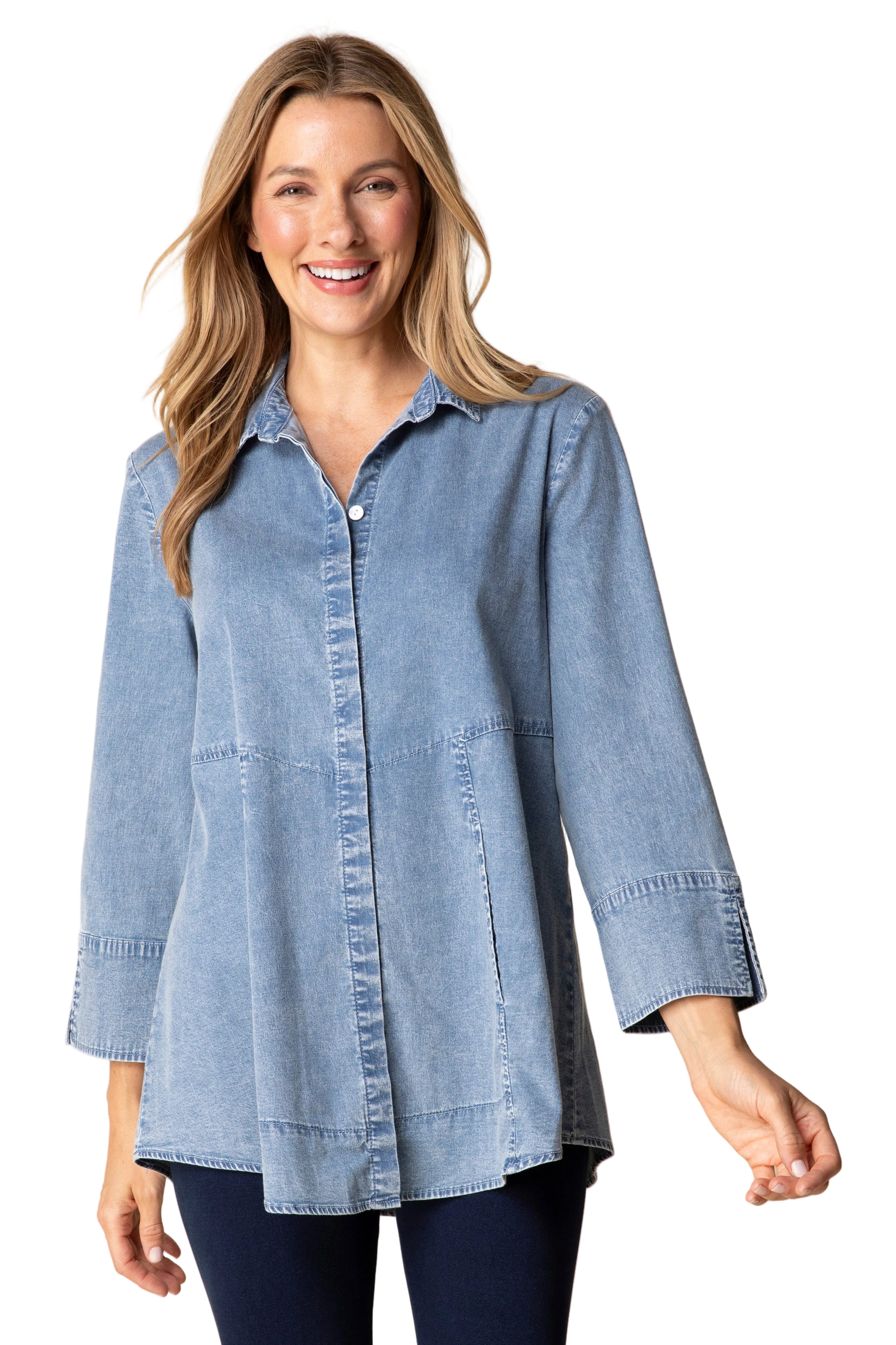 The perfect travel companion, this chambray blue shirt combines comfort with effortless style. Crafted from a breathable cotton-spandex blend, it moves with you throughout your day while maintaining its shape. The classic collared design pairs beautifully with the flattering A-line silhouette, while functional side slit pockets keep essentials within reach. Whether you're exploring a new city or transitioning from work to weekend, this versatile piece adapts to your lifestyle with ease and grace.