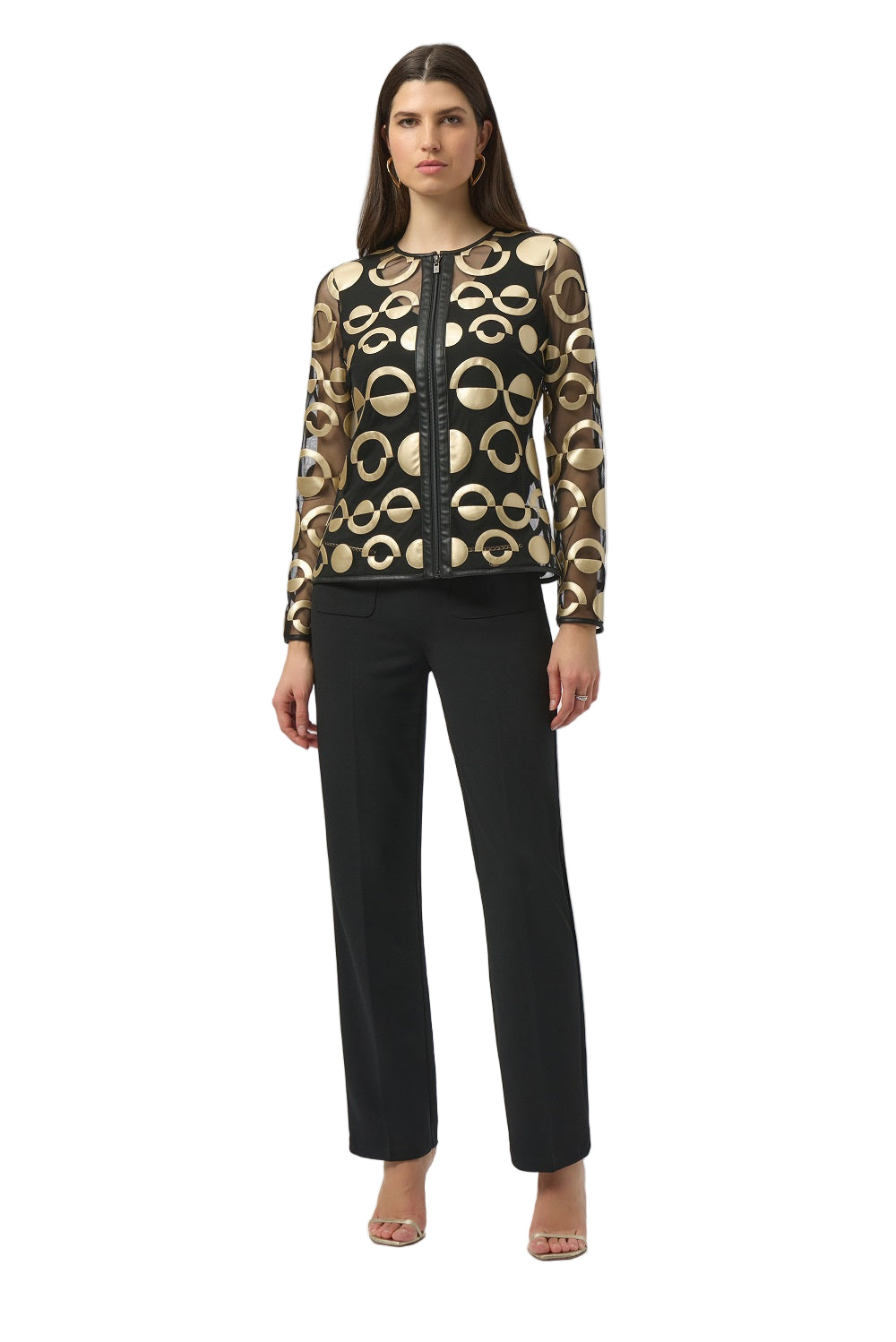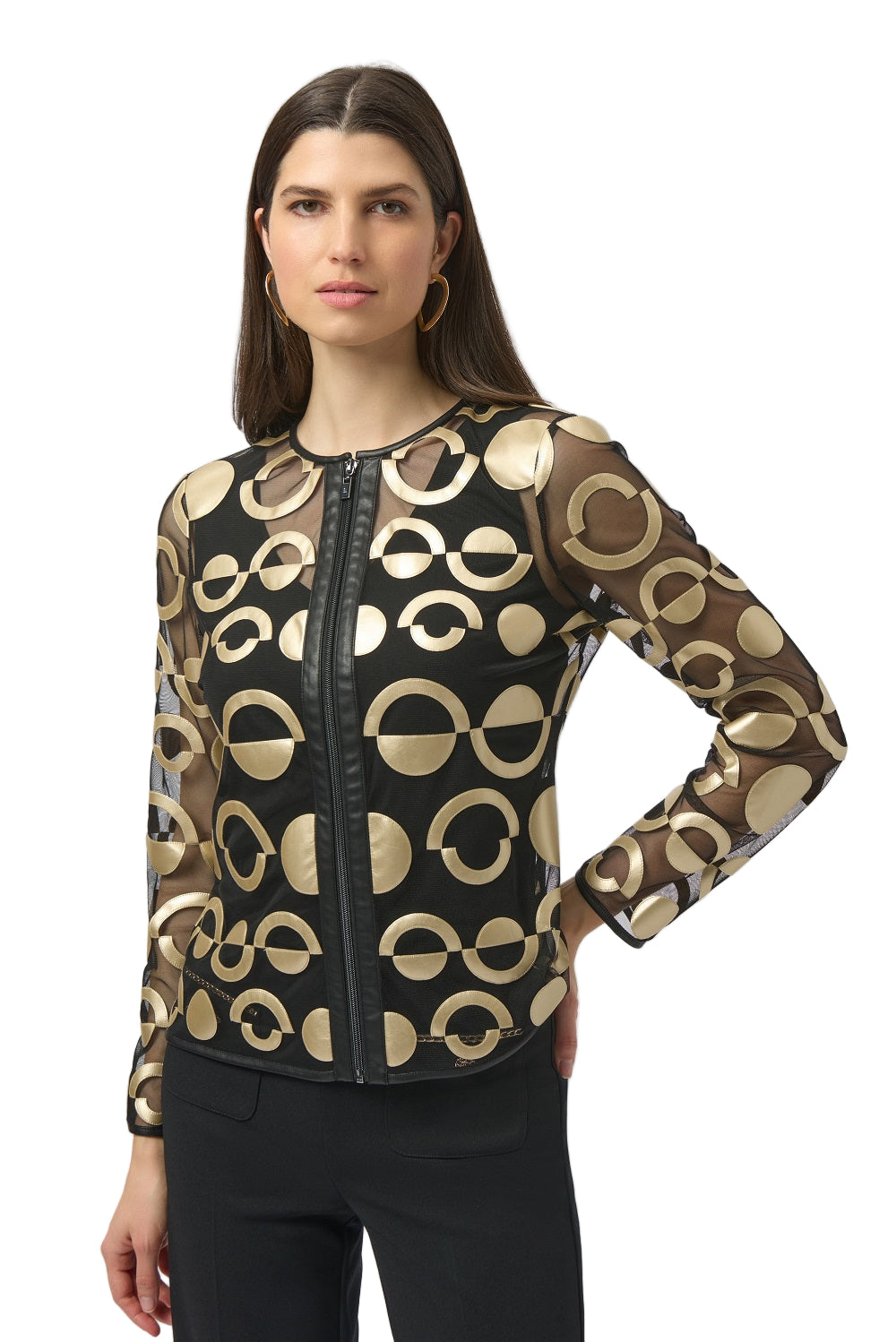 Elevate your style with the Joseph Ribkoff Mesh and Leatherette Jacket, featuring a bold fusion of mesh and leatherette materials. Its sleek, collarless design and crew neck offer a contemporary look, while the zip-front closure ensures easy wear and a touch of edge. Lightweight and unlined, this jacket delivers modern sophistication without sacrificing comfort. Perfect for making a confident fashion statement.