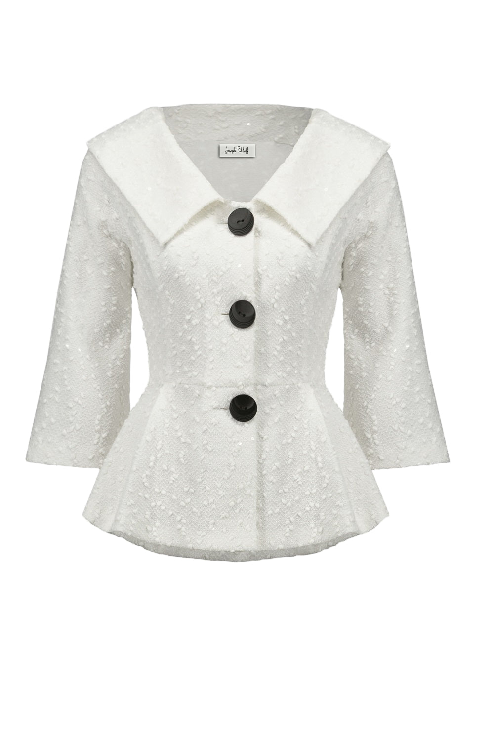 The Joseph Ribkoff Sequined Bouclé Jacket offers a perfect blend of classic elegance and contemporary style. Its delicate sequined bouclé knit adds a subtle shimmer, while the structured lapel collar and feminine three-quarter bell sleeves create a flattering silhouette. With a sleek front button closure and an unlined design, this peplum jacket delivers polished sophistication and effortless charm for any occasion.