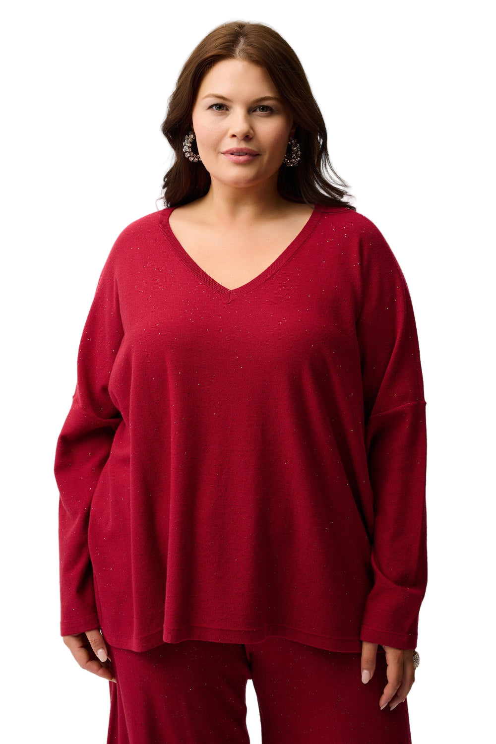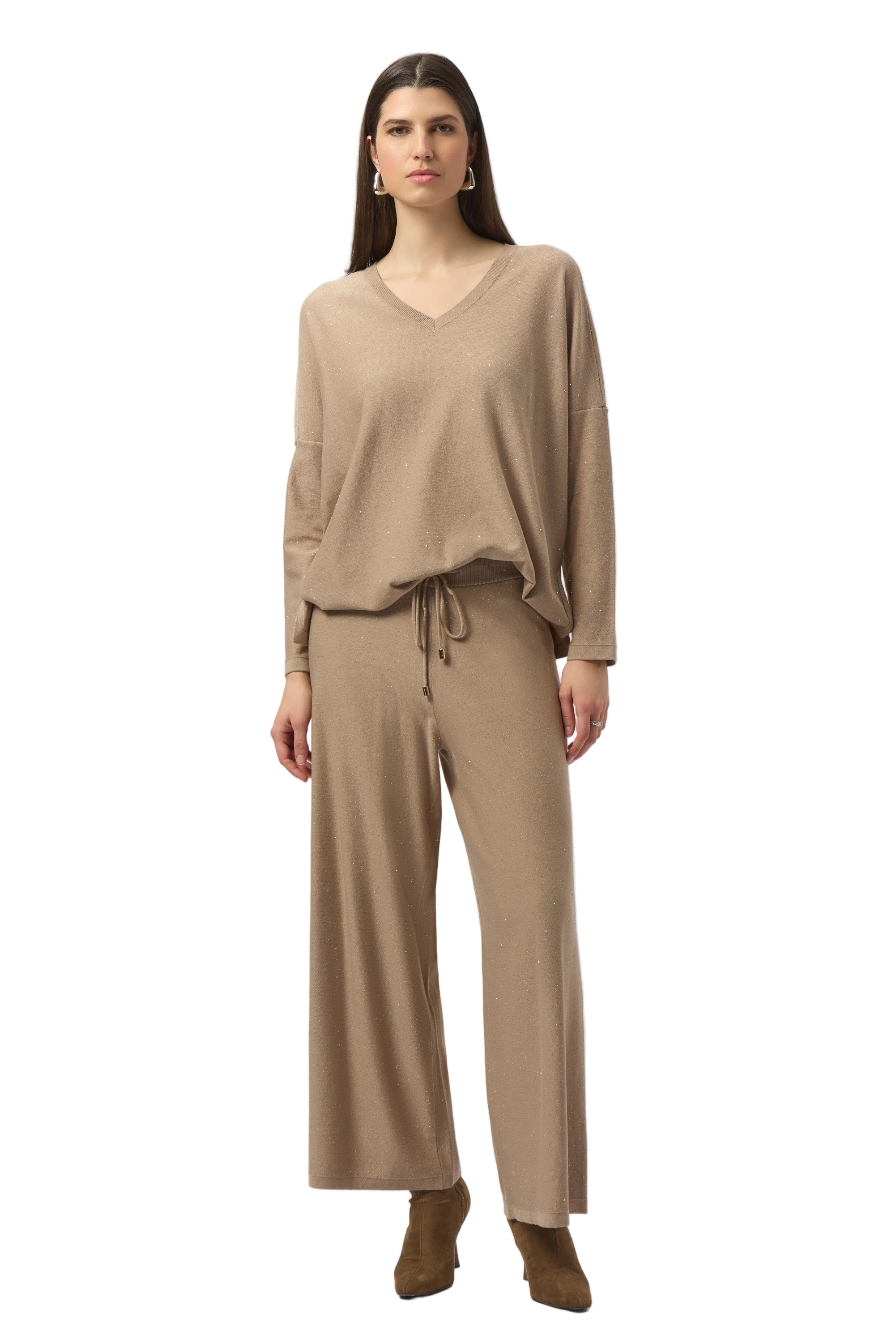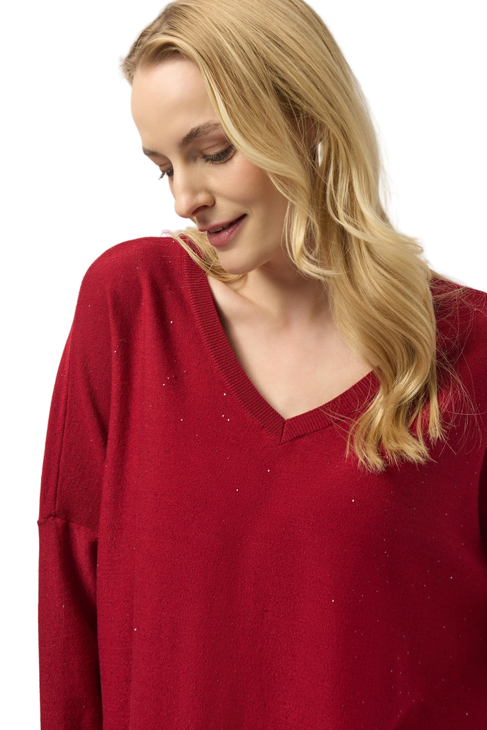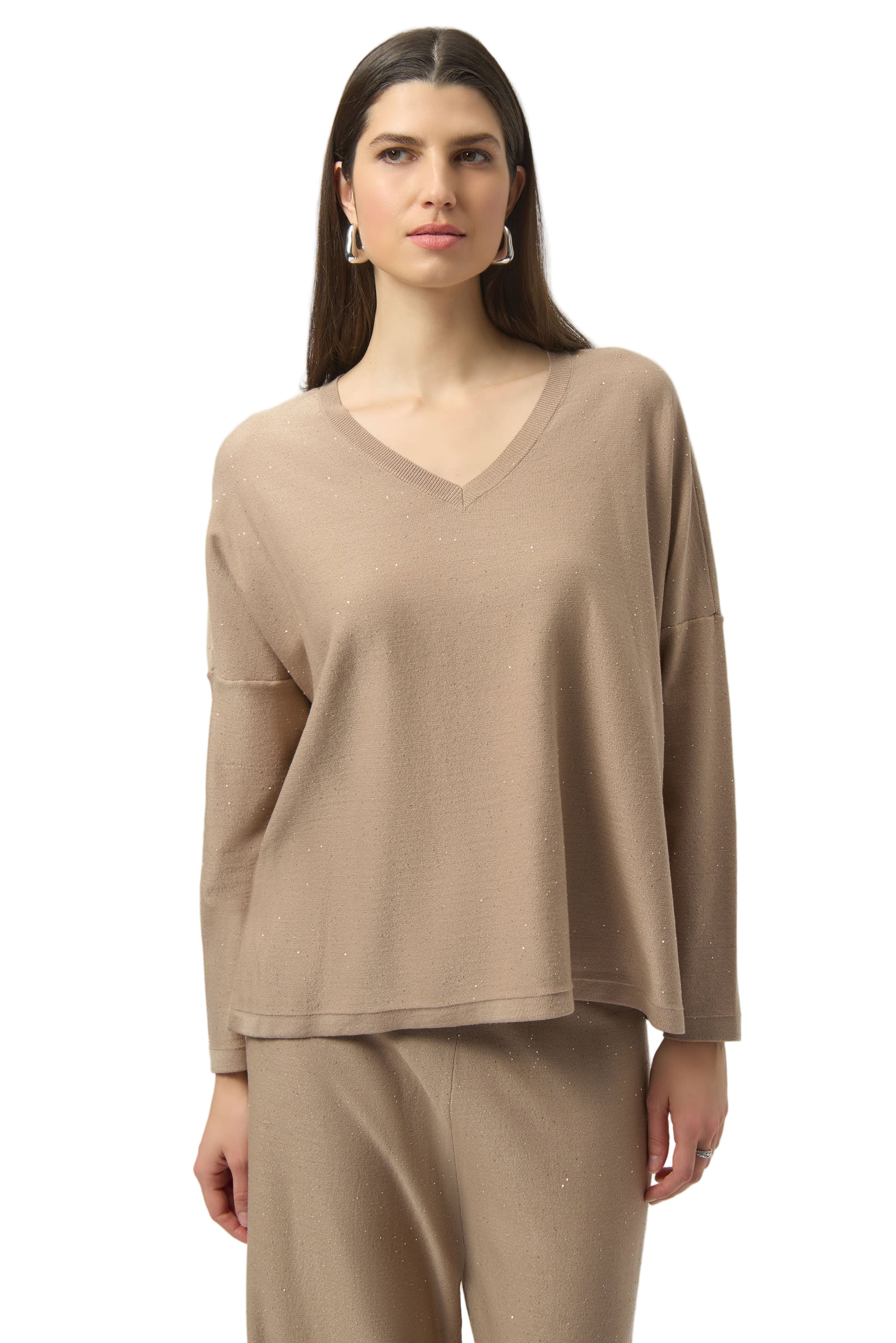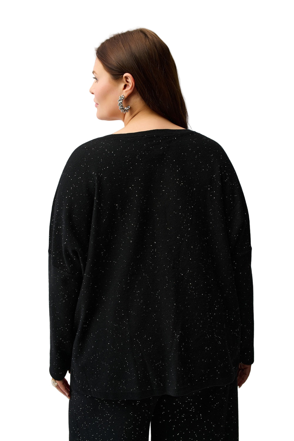 Elevate your wardrobe with the Joseph Ribkoff Sequined Sweater, crafted from a luxurious viscose blend sequin knit that adds a touch of sparkle to every look. Its relaxed boxy fit and dolman sleeves offer comfort while the classic V-neckline enhances your silhouette with effortless style. Perfect for both day and evening wear, this unlined top balances playful shine with expert craftsmanship for a standout yet versatile piece.