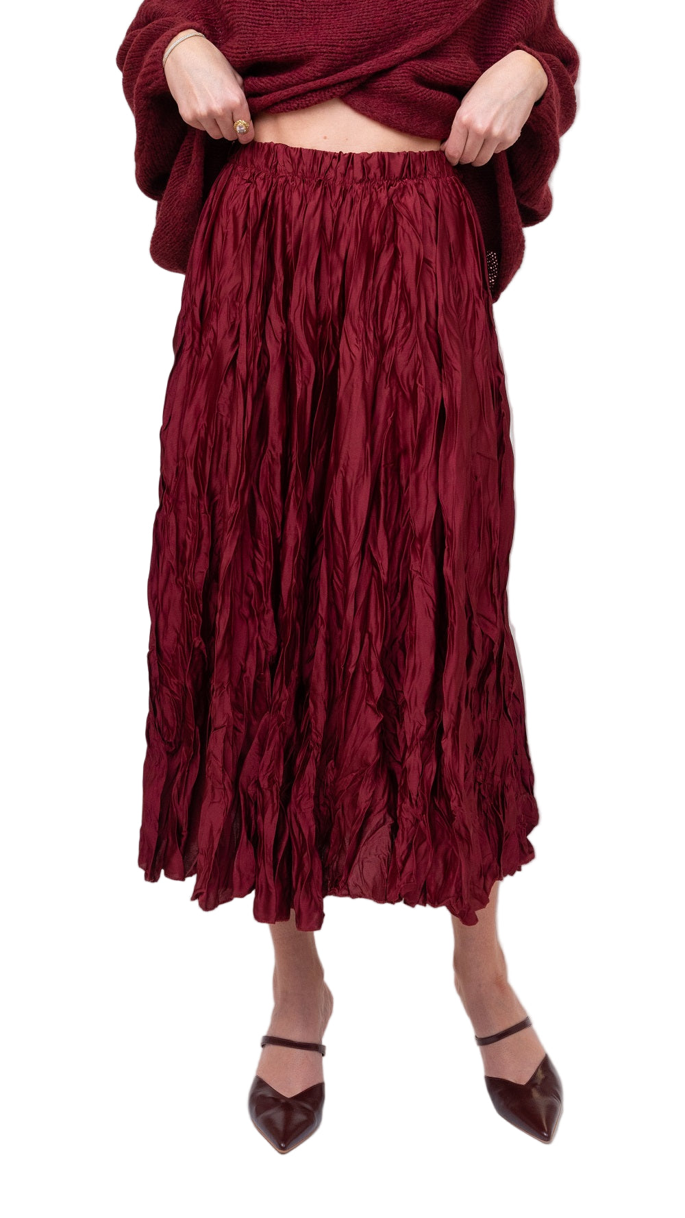 Experience effortless elegance with the Me & Gee Pull On Crinkle Skirt. Crafted from lightweight, satin-feel fabric, this skirt features a flattering full A-line silhouette and a comfortable pull-on design. Its unique crinkle texture adds subtle charm, making it perfect for both casual days and special occasions. Embrace style and comfort all in one.