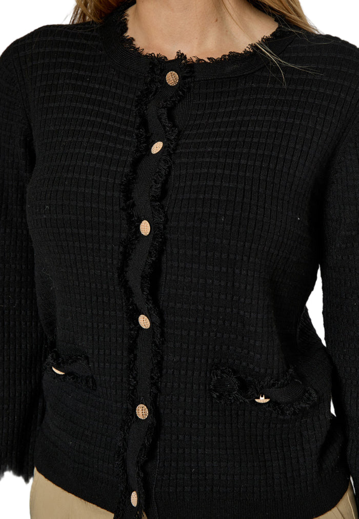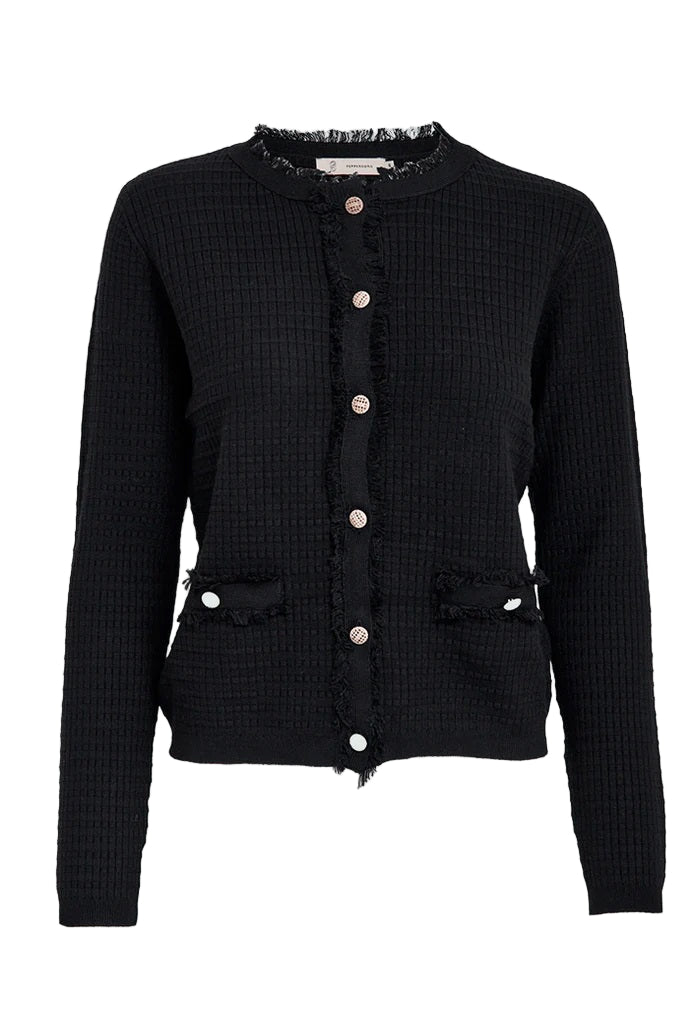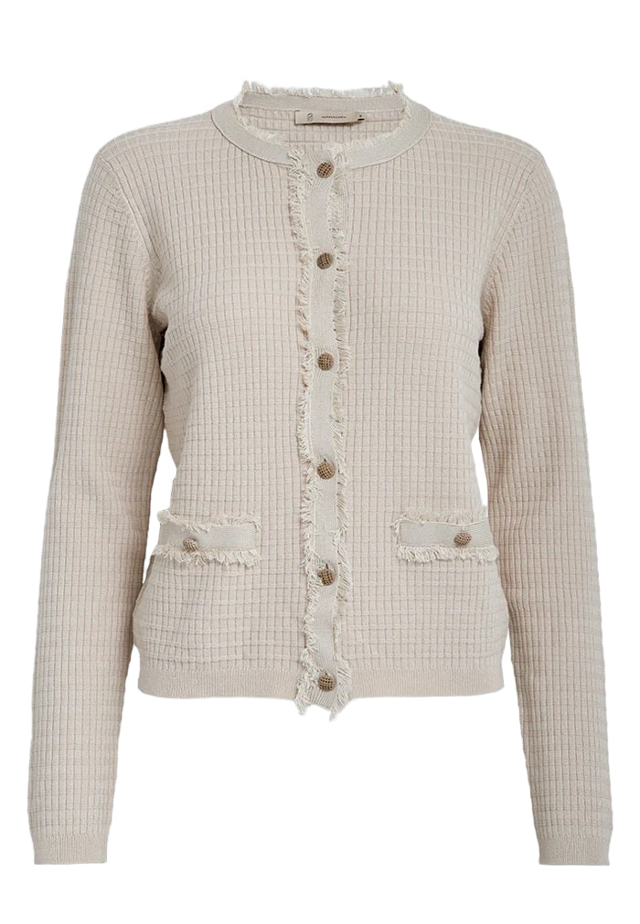 Elevate your layering with the Peppercorn Jacobe Cardigan, featuring a round neck and long sleeves for versatile comfort. Detailed with gold buttons and a button-front closure, it offers a chic touch of elegance. Practical front slit pockets add convenience, while frayed edges give a subtle, stylish finish. Perfect for adding warmth and a refined look to any outfit.
