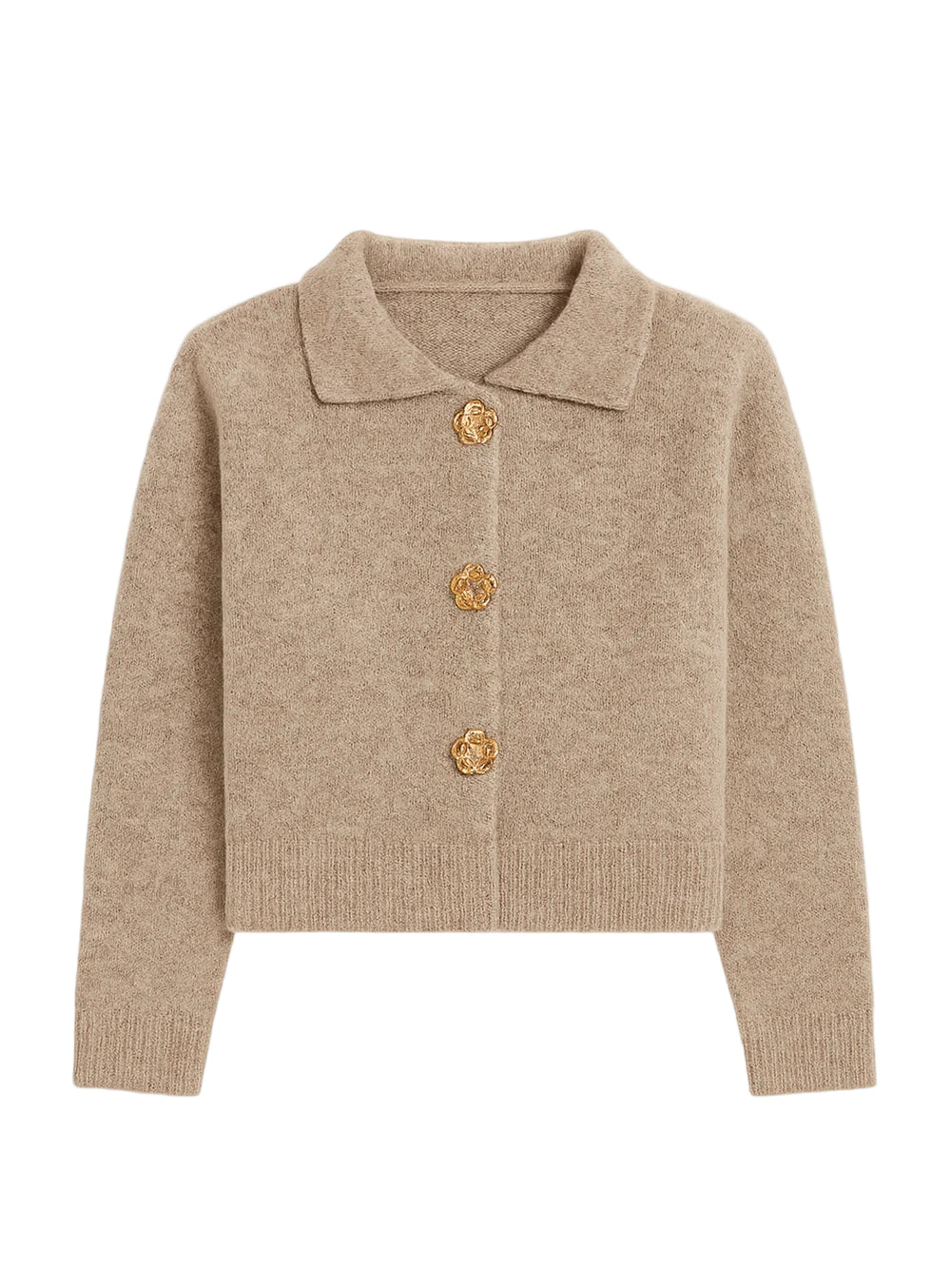 Elevate your wardrobe with the Point Zero Gold Button Cardigan, featuring sculpted gold floral detail, snap buttons that add a sophisticated flair. Its elegant shirt collar and cropped design create a flattering, modern silhouette perfect for layering. Crafted from soft, plush knit, this cardigan ensures comfortable warmth all day while enhancing any outfit with a refined touch.