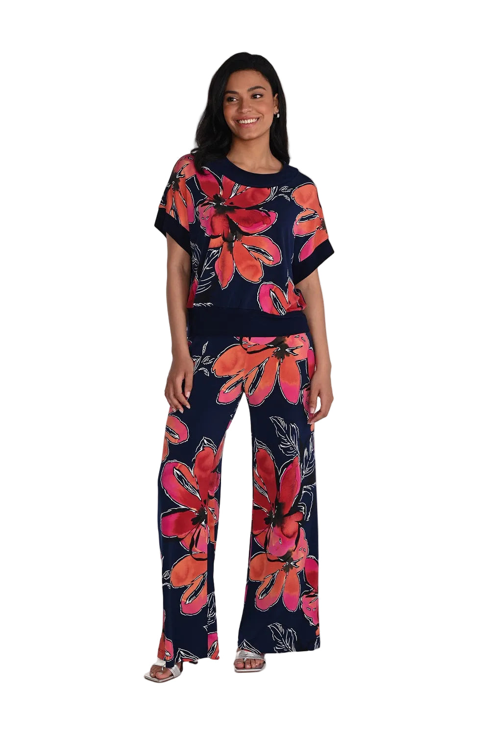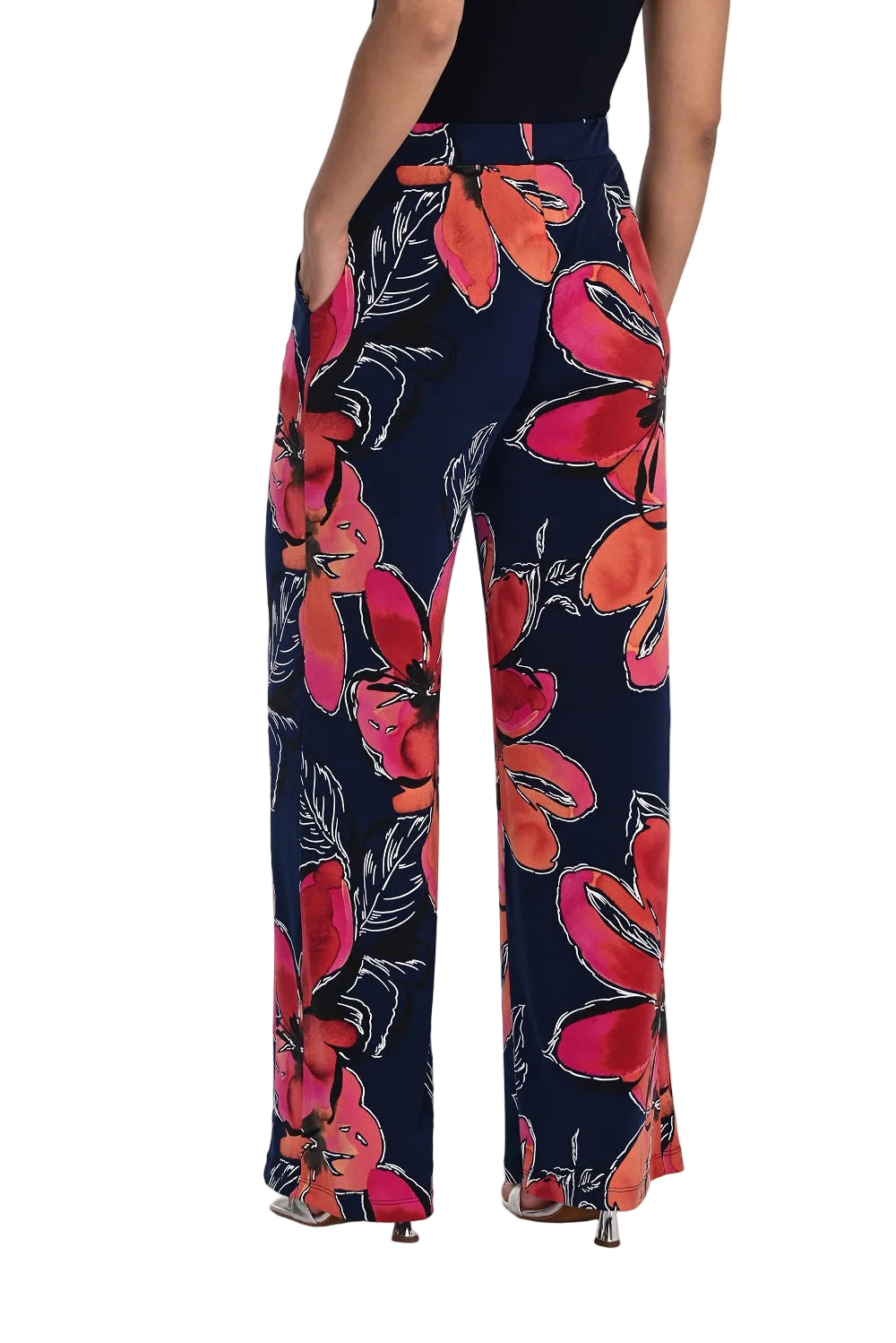 Slip into effortless style with these Frank Lyman knit pants, designed for all-day comfort and movement. The wide-leg silhouette creates a flattering, relaxed fit, while the vibrant tropical floral print in magenta pops beautifully against the rich indigo navy base. The pull-on design means no zippers or buttons—just easy dressing for work, weekend outings, or casual gatherings. Perfect for those who love bold prints and comfortable, versatile pieces that transition seamlessly through your wardrobe.
