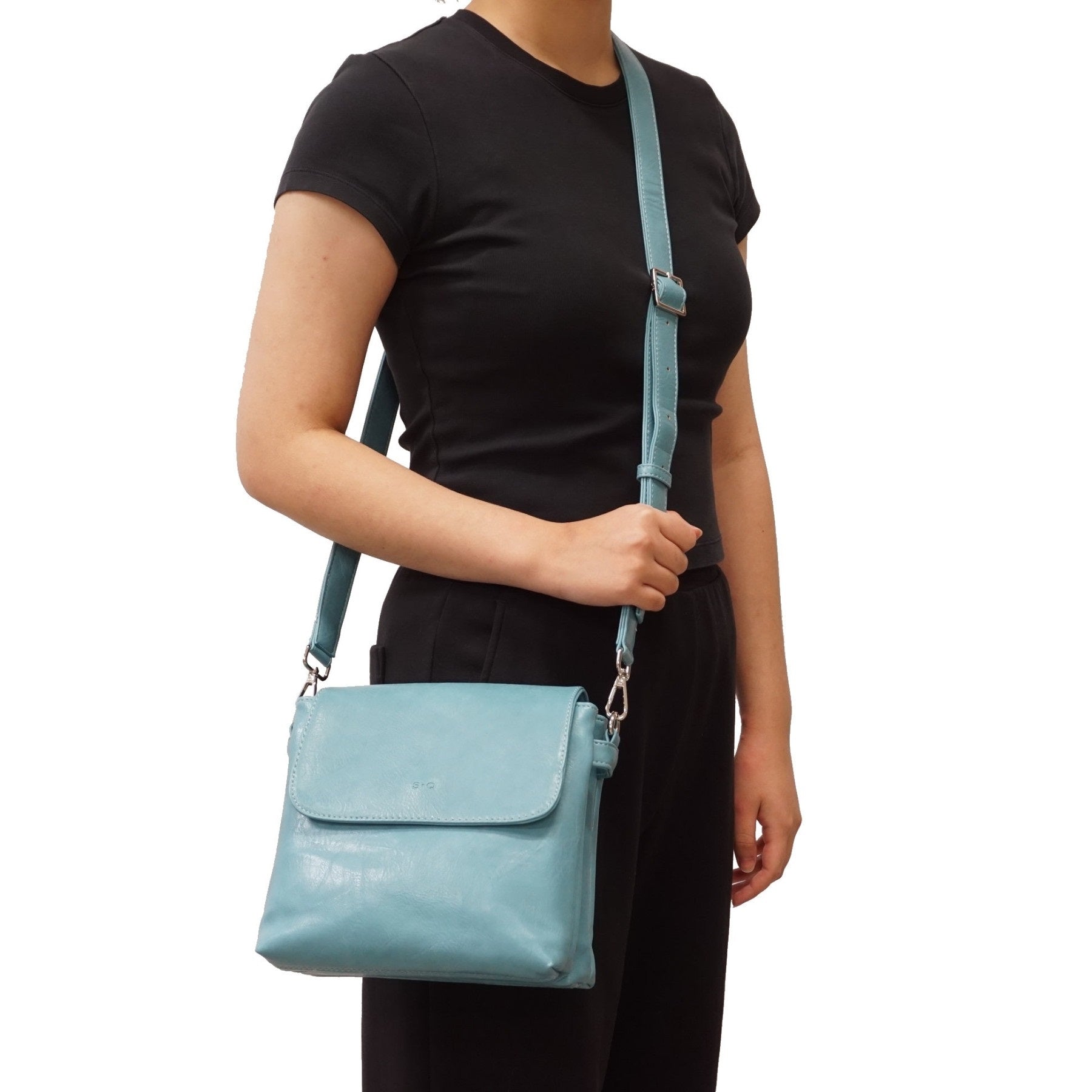 The S-Q Aura Crossbody Purse combines versatility with thoughtful design. Featuring a magnetic-closure top flap and two spacious main compartments, it adapts to your lifestyle—wear it on your shoulder or crossbody with the removable, adjustable strap. Stay organized with a back zipper pocket, interior zipper pocket, and slip pocket for essentials. Crafted from durable polyurethane with a 100% recycled nylon lining, this purse delivers both style and sustainability in one elegant piece.