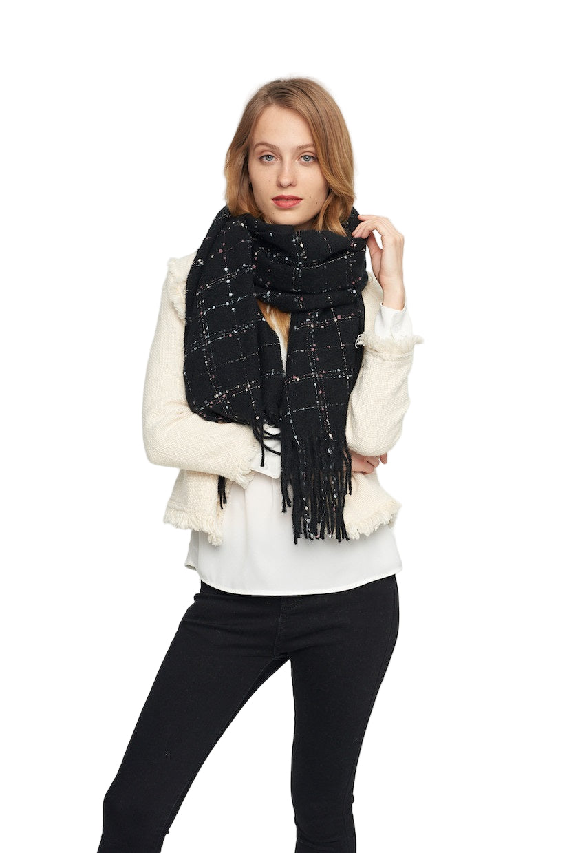 Wrap yourself in understated elegance with this knit scarf, featuring a refined fleck plaid pattern that adds visual interest without overwhelming your look. Crafted from soft knit fabric, it drapes beautifully while maintaining its shape. Finished with delicate fringe detailing along the edges, this versatile piece transitions seamlessly from casual to polished styling. An essential accessory for the discerning wardrobe.