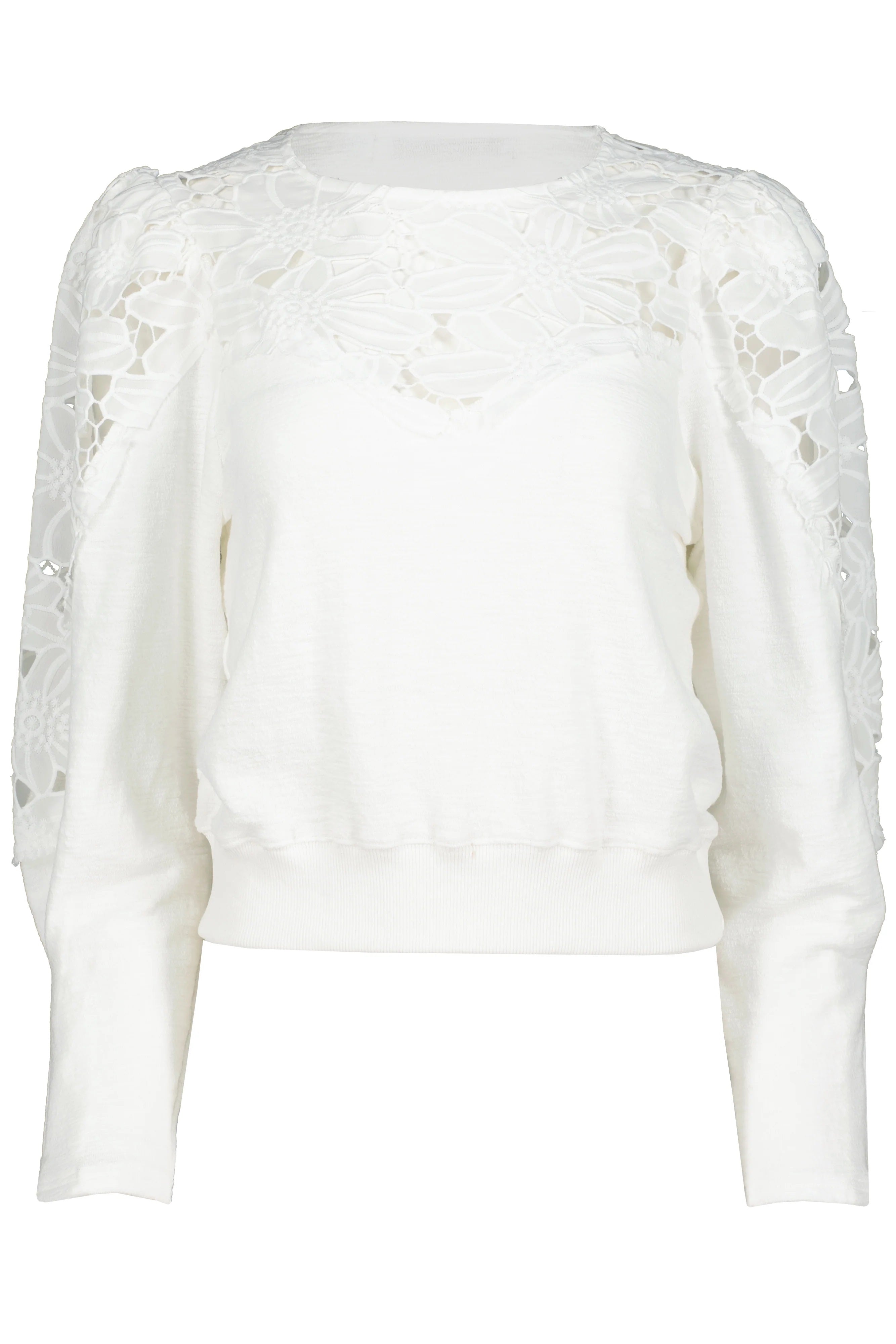 A refined essential with a romantic twist, this white pullover features intricate floral patterned lace cutout detailing along the shoulders and sleeves for a subtle statement. Soft, structured, and endlessly versatile, it's designed to elevate your everyday wardrobe.
