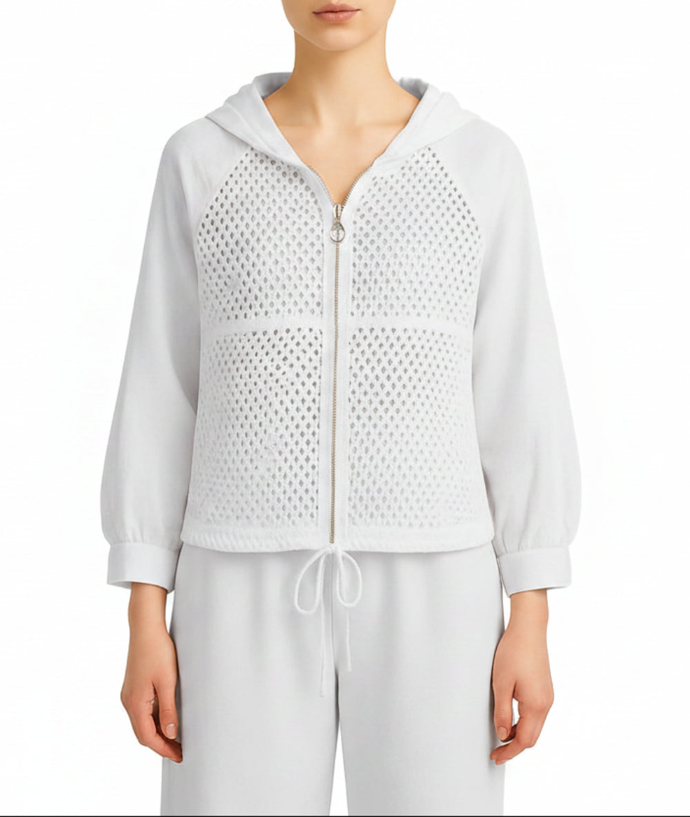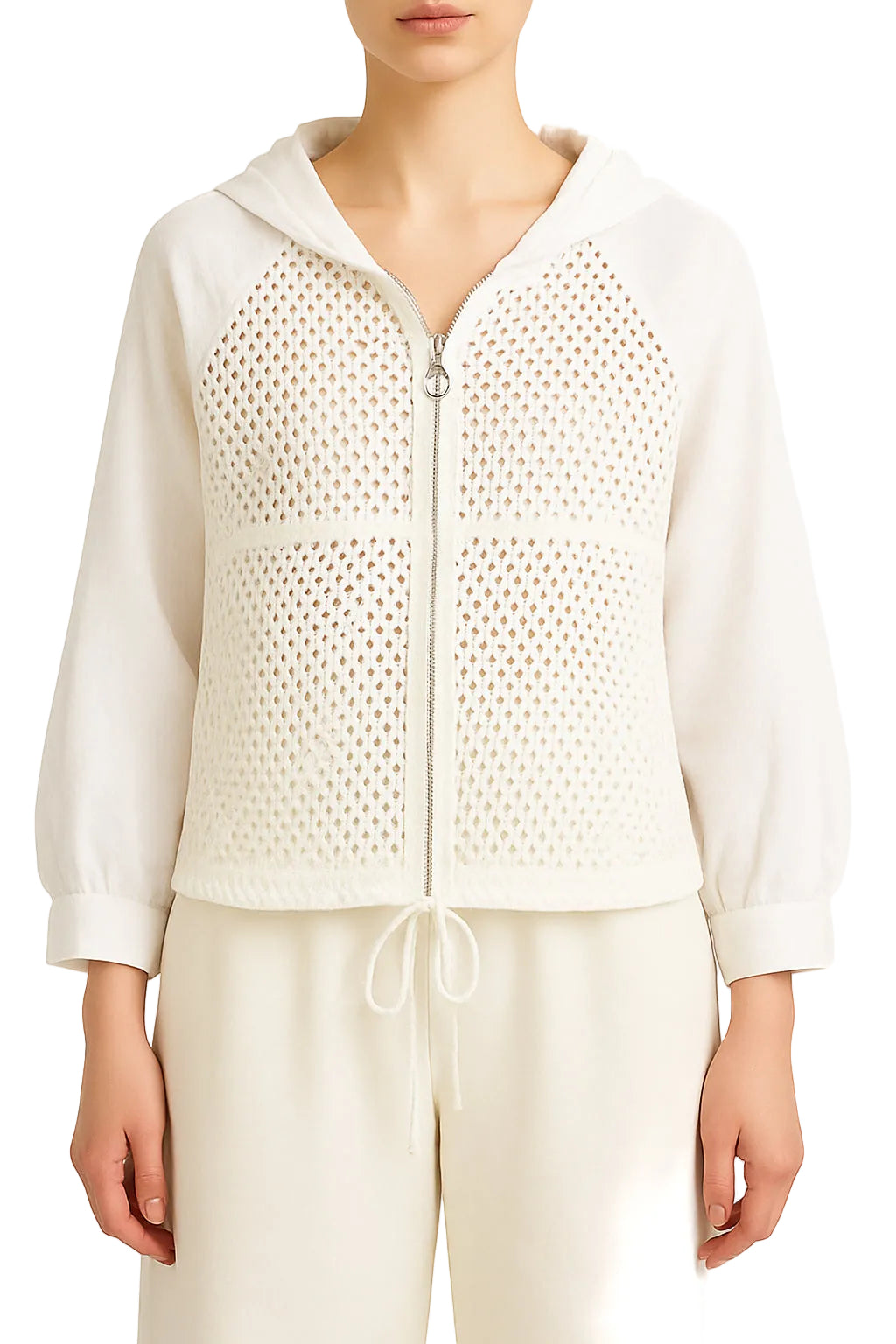 Lightweight linen hoodie with a striking mesh front detail that adds texture and visual interest. Features a full front zipper for easy layering and adjustable comfort. Long sleeves provide coverage while the breathable linen fabric keeps you cool and comfortable. Perfect for casual wear or layering on warmer days.
