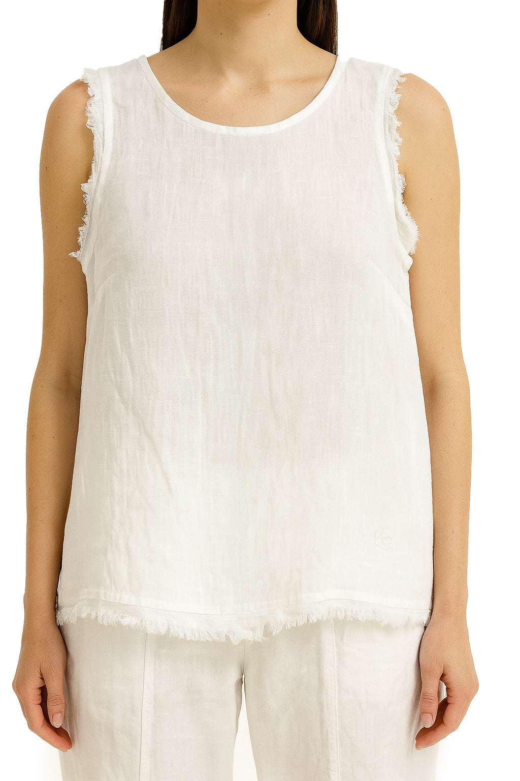 Effortless linen elegance meets artisanal detail. This tank features a classic round neckline and squared-off hemline for a modern silhouette, while intentionally rough-edged arm holes and hem create an undone, lived-in aesthetic. Crafted from breathable linen, it's perfect for layering or wearing solo during warmer months. The relaxed fit and textured edges give it an understated, high-low appeal that works from casual days to dressed-up evenings.