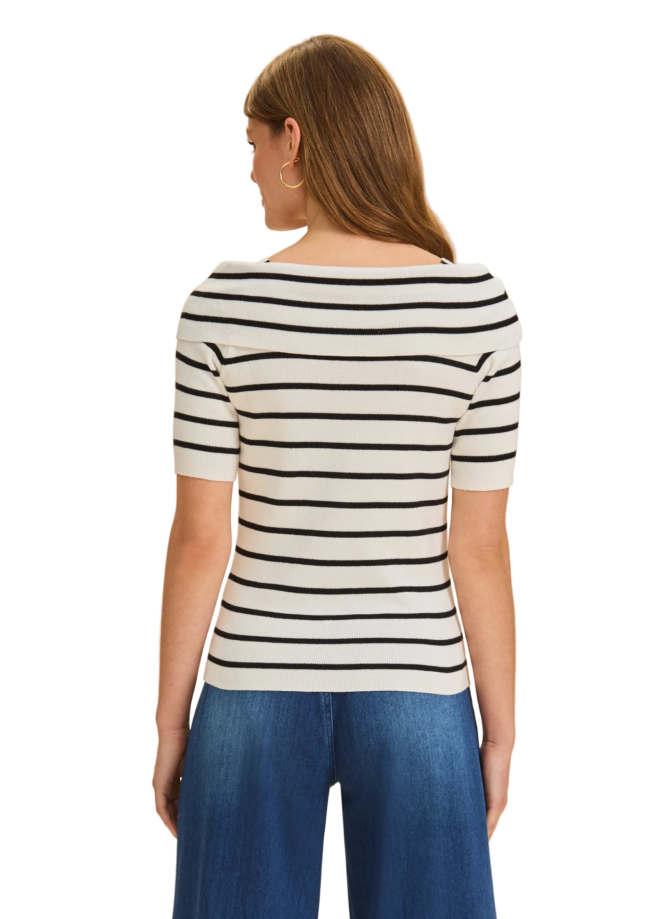 Effortless elegance meets casual comfort in this FDJ boatneck sweater. The classic twisted neckline adds a subtle design detail, while crisp stripes keep things visually interesting. Short sleeves make it perfect for layering or wearing solo, and at 22 inches in length, it hits just right for a flattering fit. Whether you're dressing up a pair of jeans or pairing it with tailored trousers, this versatile piece brings a touch of timeless style to any wardrobe.