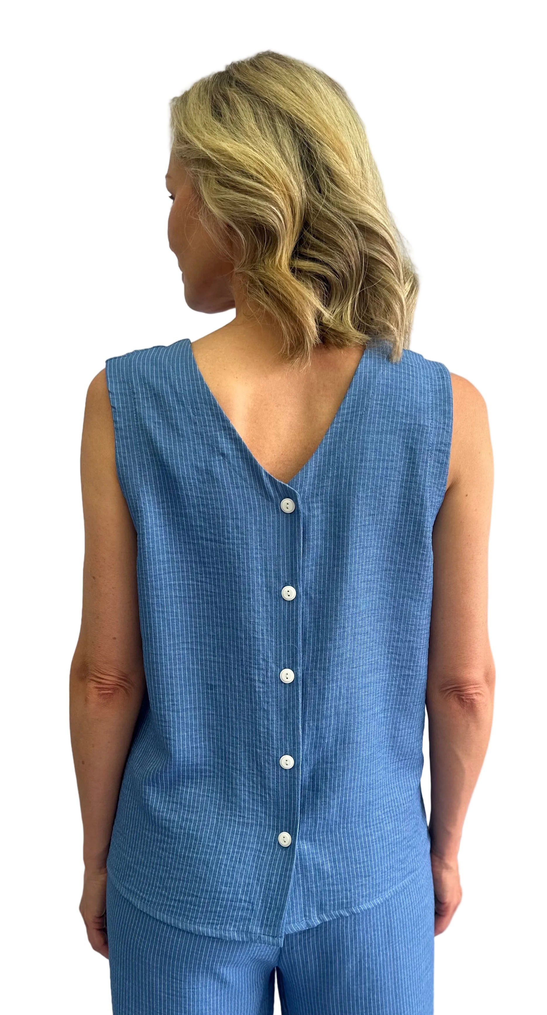 Effortless elegance meets everyday comfort in this versatile tank. The clean v-neckline and sleeveless silhouette offer a flattering, breathable fit perfect for layering or wearing solo. A distinctive v-shaped button detail adorns the back, adding visual interest and a touch of sophistication. The longer length provides coverage and a polished look whether styled casually or dressed up. A wardrobe essential that transitions seamlessly from season to season.