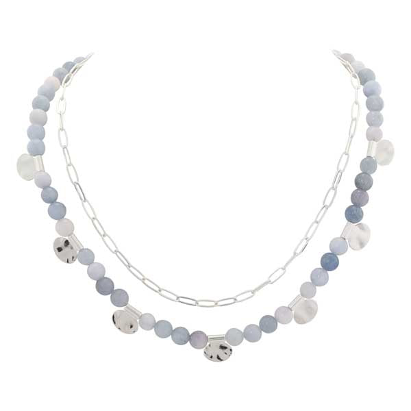 Elevate your everyday elegance with this stunning double-strand necklace featuring luminous blue opal beads paired with polished silver oval accents. The layered design creates beautiful dimension and movement, while the cool blue tones complement any skin tone. Perfect for adding a touch of sophistication to casual outfits or dressing up special occasions. A versatile piece that transitions seamlessly from day to night, this necklace celebrates natural beauty with its iridescent gemstone appeal.