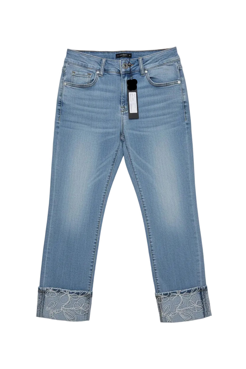 Effortless style meets playful detail with these pull-on denim jeans. Featuring a classic 5-pocket design and a comfortable pull-on fit, they're perfect for everyday wear. The standout sequin-embroidered cuffs add a touch of sparkle and personality, while the bleach-faded finish gives them a relaxed, lived-in look. Versatile enough to dress up or down, these jeans are a wardrobe essential with an eye-catching twist.
