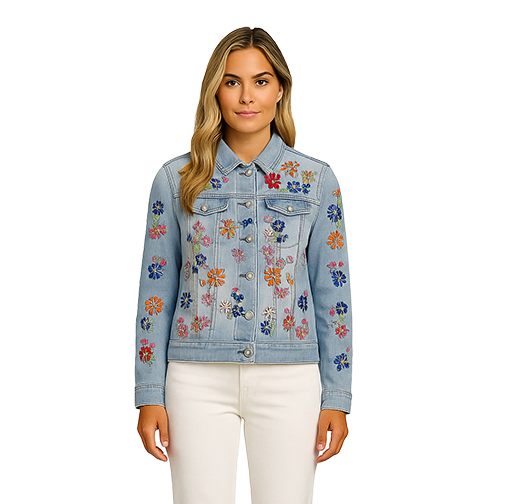Elevate your denim with this stunning beaded floral jean jacket. Featuring intricate beadwork that brings botanical elegance to classic denim, this collared, long-sleeve style combines timeless appeal with eye-catching detail. The button-front closure and front breast pockets deliver practical functionality, while the ornate beading transforms an everyday staple into a statement piece perfect for layering or wearing solo.