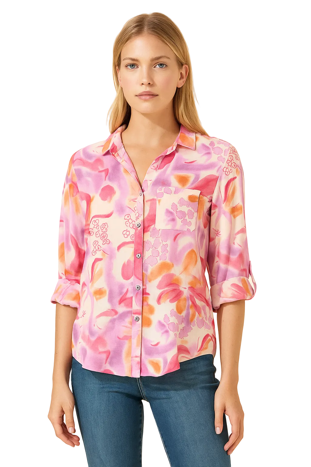 Effortless elegance meets comfort in this versatile collared shirt. Crafted from breathable Tencel fabric, it features a charming floral print that transitions seamlessly from casual to polished looks. The button-down front and rolled tab sleeves add contemporary flair, while the rounded hemline creates a flattering, modern silhouette. Perfect for layering or wearing solo, this piece brings timeless style to your everyday wardrobe.