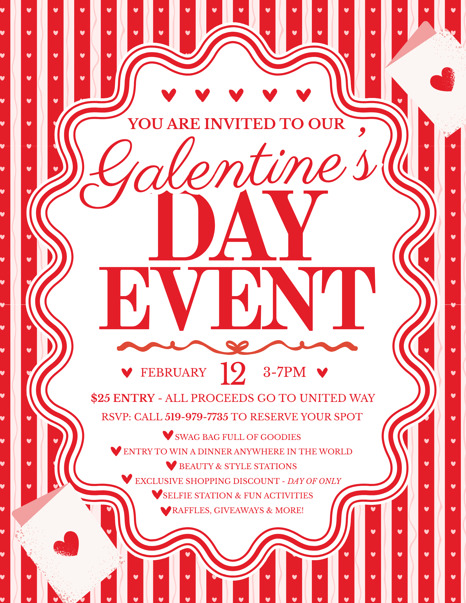 Join us for a fun filled evening at our Annual GALENTINE'S DAY EVENT! Bring a friend and support United Way. Enter to win a chance to have dinner anywhere in the world. Enjoy swag, special discounts, and refreshments. Don't miss out on this opportunity to give back and have a great time. Ticket required